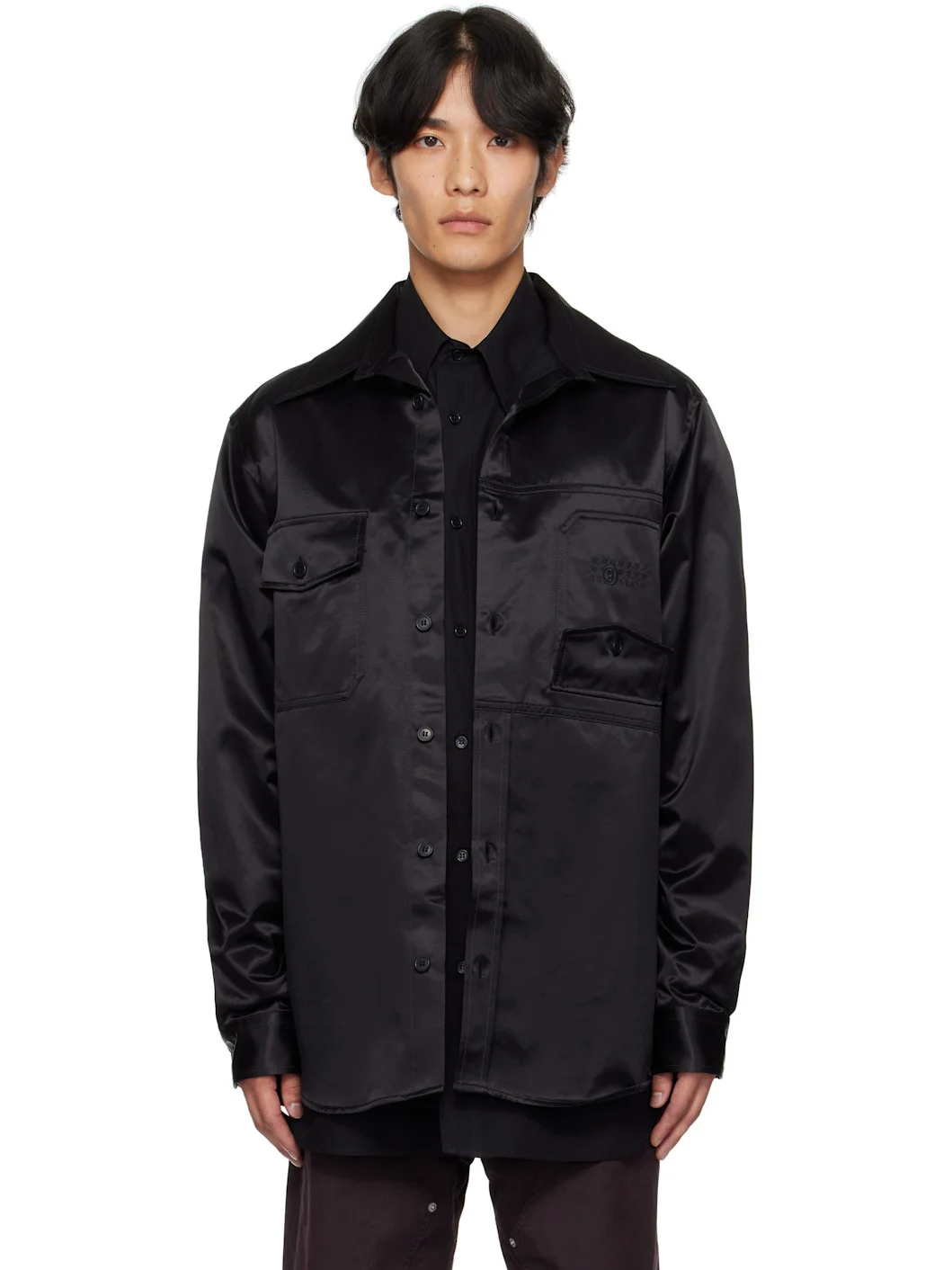 Cotton- and viscose-blend satin shirt. · Spread collar · Button closure · Flap pockets at chest · Logo embroidered at flap pocket · Shirttail hem · Buttoned barrel cuffs · White stitching at back collar · Twin pleats at back yoke Supplier color: Black 57% cotton, 43% viscose. Made in Italy 252188M192004