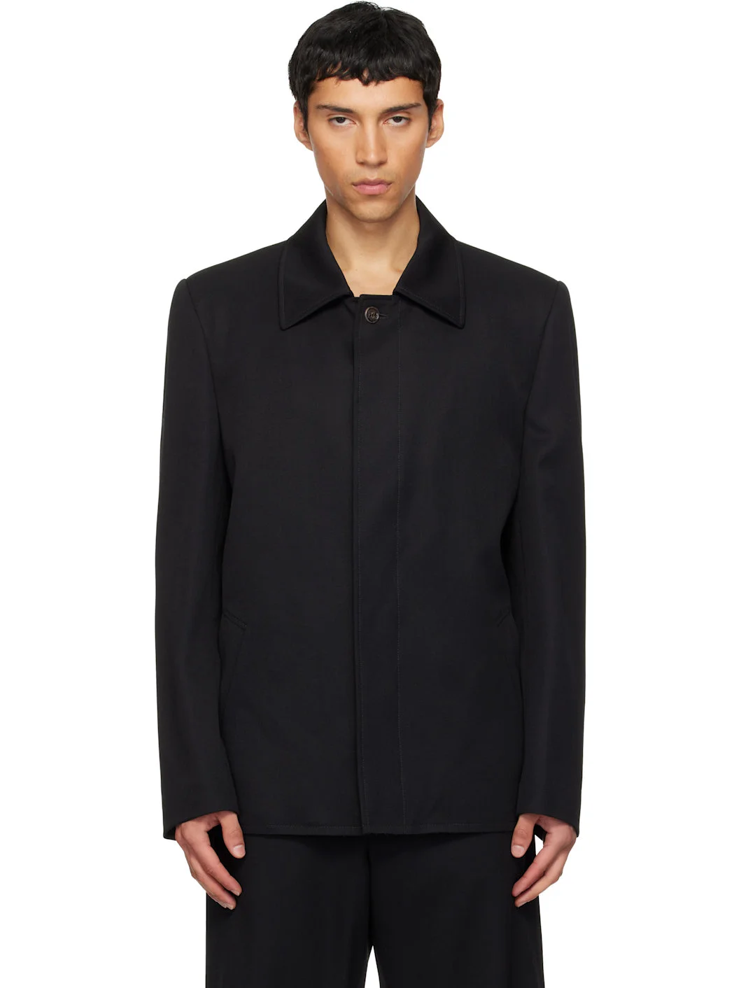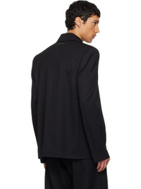 Virgin wool twill jacket. · Spread collar · Button closure · Welt pockets at front · Raw edge at hem · Padded shoulders · White stitching at back collar · Welt pocket at interior · Full satin lining Supplier color: Black Body: 100% virgin wool. Lining: 100% viscose. Made in Italy 261188M180012