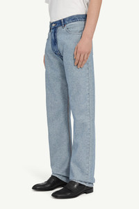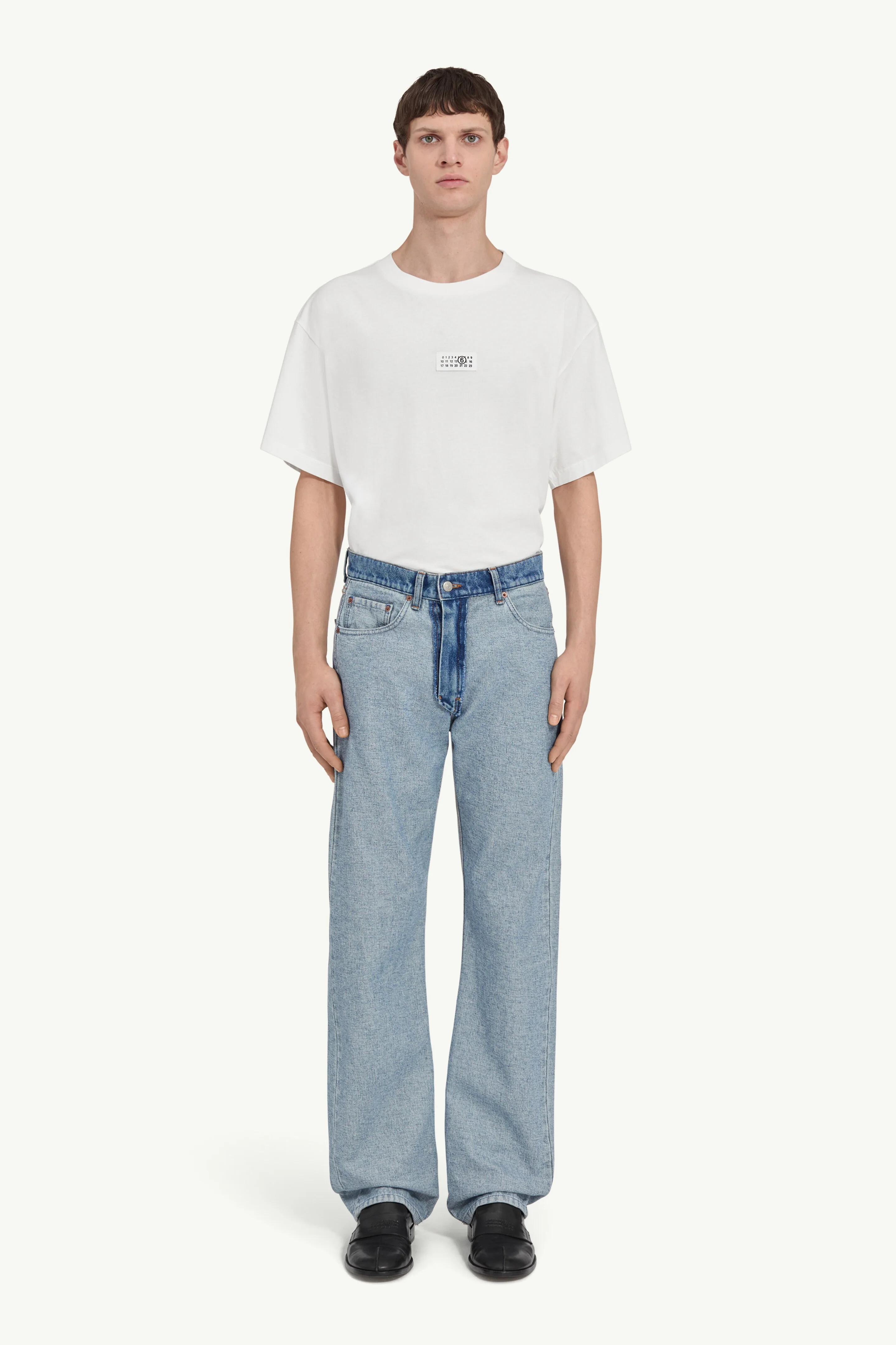 These light-washed jeans subvert tradition with tonal contrast: the waistband and fly appear reinserted in a deeper indigo, as if a memory of another garment. The fit is straight and understated, with gentle volume through the leg. At the back, the white stitch line speaks to the MM6 identity. Product Details Item ID SH0LA0026M30018967 Primary fabric: 100% Cotton Pocket Lining: 65% Polyester, 35% Cotton Light wash denim with a textured appearance Visible button closure at front Contrast waistband and seam detailing Five-pocket style, including coin pocket High waist with straight-leg cut Belt loops at waistband White stitch line at the back Made in Italy Model is 190 cm tall and wears a size 32.