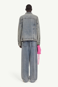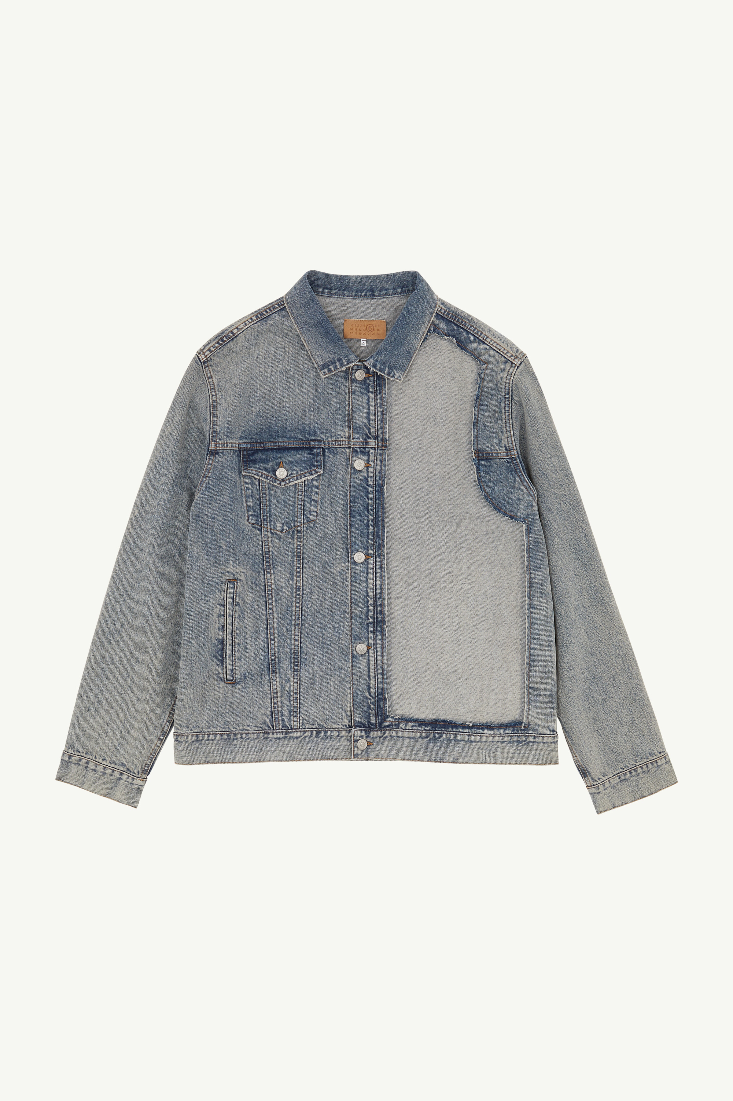 Made from mid-weight blue denim, this jacket is shaped to an slouchy frame and detailed by button closure, buttoned flap pockets and cuffs and adjustable waist tabs. MM6's discreet yet distinct signature, a horizontal line of white stitches is found on the back of the garment. Product Details Item ID SH0AM0019S30844962 Composition: 100% cotton Pocket lining: 65% polyester, 35% cotton Mid-weight blue denim jacket Button closure Buttoned flap pocket Buttoned cuffs Adjustable waist tabs White stitch line at the back Made in Italy Model is 6'2" tall and wears a size 48.