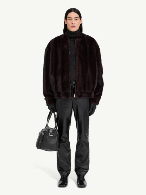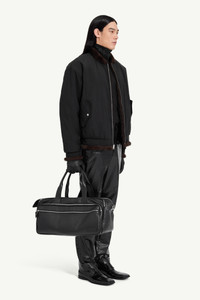 A reimagining of the classic bomber, this jacket contrasts matte fabric with tactile shearling-style trim. The relaxed, padded silhouette channels flightwear references with a softened edge, while utility pockets retain its functional roots. At the back, MM6’s signature white stitch line affirms its identity. Product Details Item ID SH2AM0044MTN122962 Primary fabric: 100% polyester Bomber jacket with faux shearling trim Zip fastening at the front Ribbed cuffs and hem Side flap pockets with snap buttons Zipped utility pocket at the sleeve Faux shearling at the collar, cuffs and hem White stitch line at the back Made in Italy Model is 188 cm tall and wears a size 48.