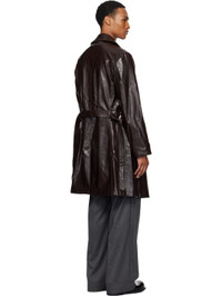 Grained faux-leather jacket. · Hook-eye fastening at notched lapel · Double-breasted button closure · Welt pockets at front · Belt loops and detachable cinch belt · White stitching at back collar · Central vent at back hem · Welt pocket at interior · Full satin lining Supplier color: Burgundy Body 1: 100% viscose. Body 2: 100% polyurethane. Lining: 100% viscose. Made in Italy 252188M181000