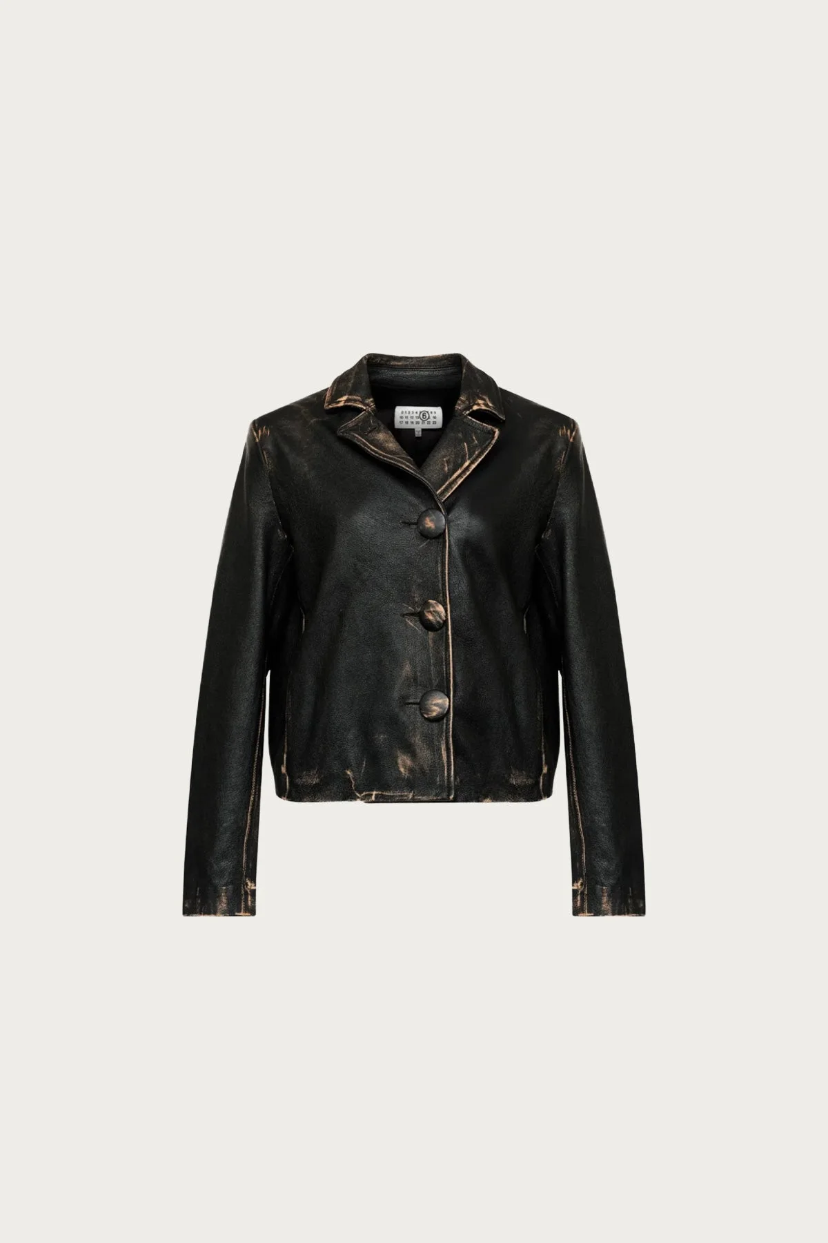 A cropped leather jacket that leans into MM6’s offbeat approach to everyday staples. Cut from 100% PVN, the surface carries a worn, almost burnished finish, with highs and lows that give it the look of something already lived in. The shape is compact and slightly boxy, sitting high on the waist with a clean, minimal front. Three oversized buttons and a sharp collar keep the design stripped back, letting the texture and patina do the work. Subtle distressing along the seams and edges adds depth without feeling overworked. Style it with high rise trousers or denim to balance the cropped length, or throw it over a simple dress or tee and skirt to contrast the structure with something softer. - Material Outer: 100% PVN