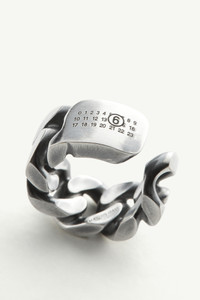 Embossed with MM6’s numeric artwork, this chain earcuff disrupts the rigidity of traditional bands with its linked structure, transforming an industrial reference into a wearable expression of the Maison’s deconstructed ethos. Product Details Item ID SM6VG0101SV0235954 Body: 100% Brass Chain-link ring in brass Engraved numeric signature Open band construction Made in Italy