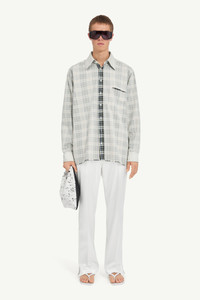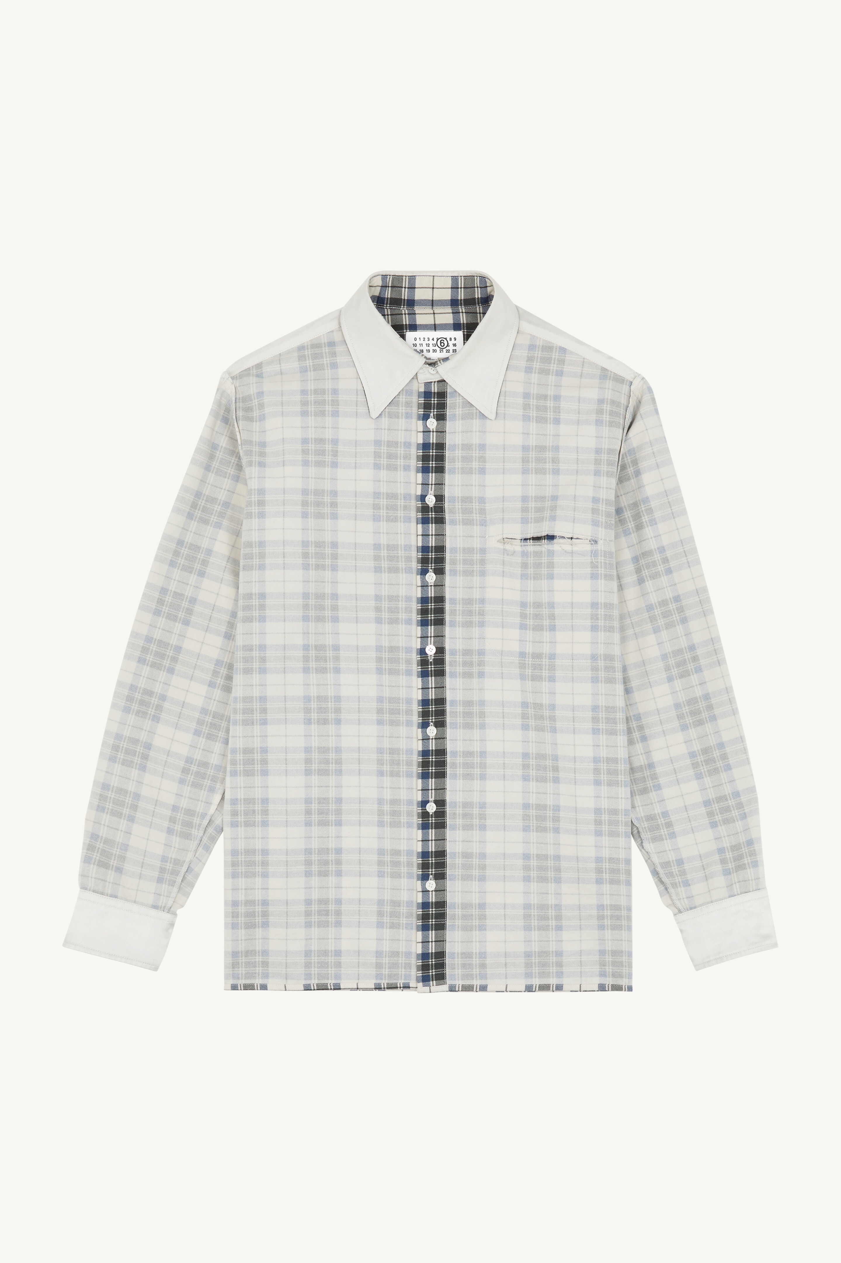 This check-print cotton shirt explores MM6’s philosophy of self-expression through a series of subtle disruptions. A slit pocket, contrast interior collar, and a sense of reversed button detailing challenge archetypal design, while the Maison's numeric artwork and white stitch line to the back add a subversive signature. Product Details Item ID SH2DT0016M35444001S