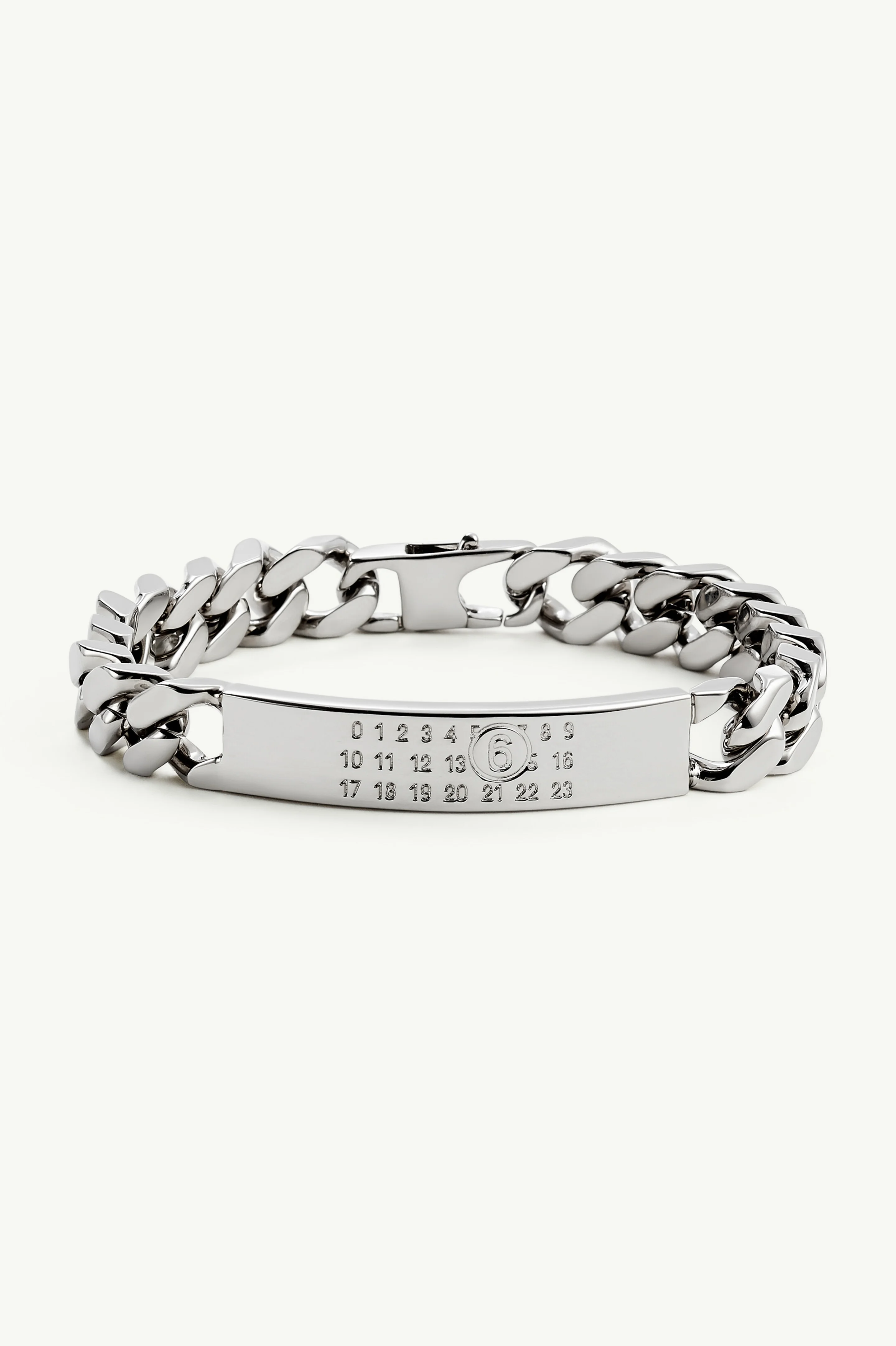 Chain bracelet in brass, inspired by classic Margiela chain jewellery designs. Displays an engraved numerical signature on a plate. Product Details Item ID SM6UY0049SV0235951 Composition: 100% brass Polished Palladio Classic chain bracelet Engraved MM6 numeric signature on the tag Made in Italy The item comes in a white zipped bag