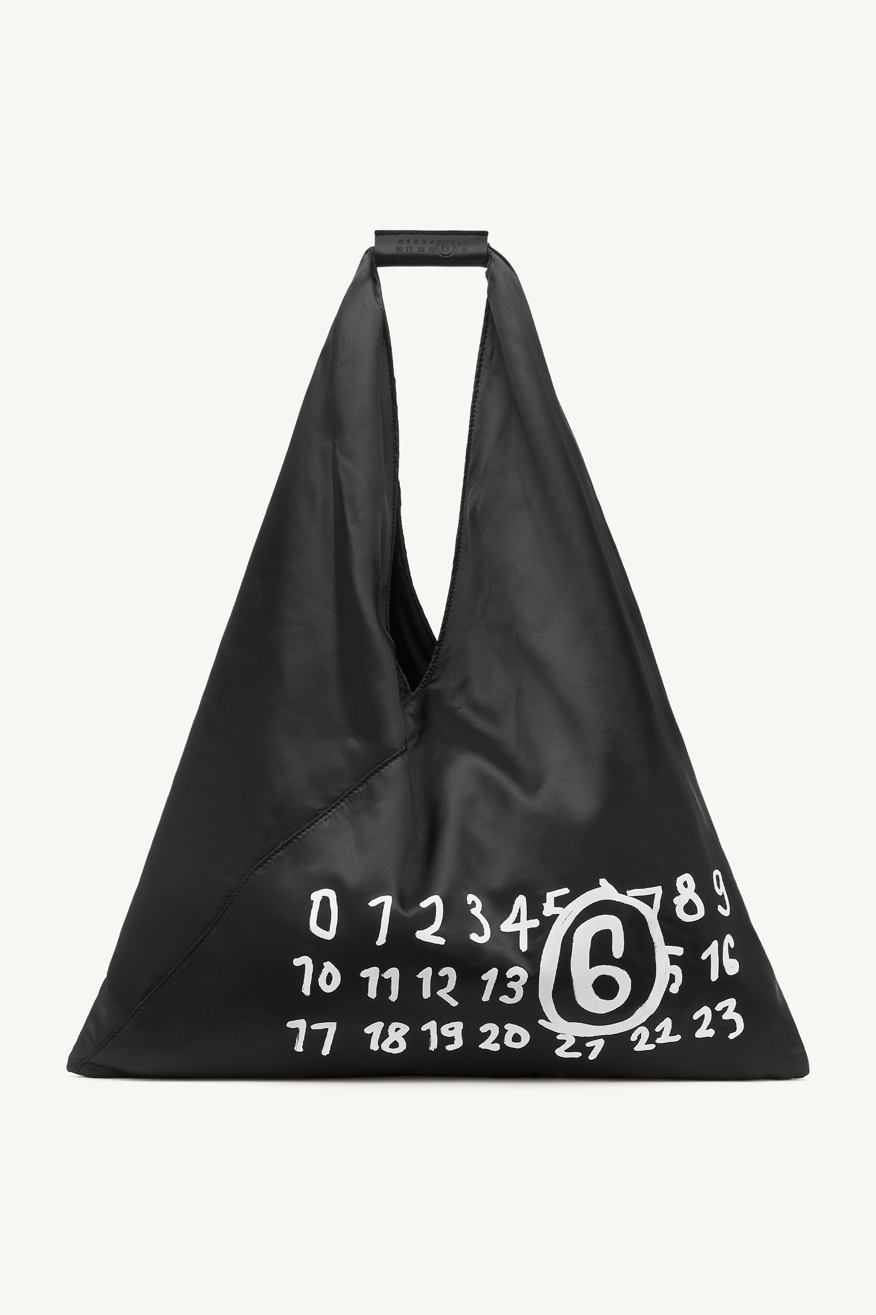 A staple since 2009, the iconic Japanese bag adopts a fresh durable new form, featuring the Maison's numeric signature leather cuff and handwritten artwork. Designed for versatility, its structure allows its silhouette to dynamically change shape. At the back, a discreet white stitch line subtly underscores the MM6 signature. Product Details Item ID S54WD0039P7184T8013 Body: 100% viscose-rayon Contrast: 100% calf leather Lining: 100% polyester Shoulder bag in lining fabric MM6 numeric signature leather cuff Handwritten numbers logo at the front Two snap buttons at the edge to change the shape White stitch line at the back Button closure Inside pocket with button closure Made in Italy Height: 55 cm/21,6 in Width: 2 cm/0,8 in Length: 50 cm/20 in Handle drop: 20 cm/7,8 in
