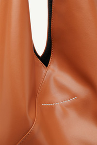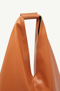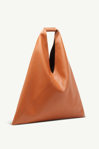 Japanese bag classic medium in PU leather. First introduced as part of the Autumn-Winter 2009 collection, the Japanese bag has since become MM6’s most emblematic accessory. Its distinctive triangular silhouette is inspired by the Japanese art of paper folding: origami. The buttons at its edges allow for the bag to change form through folding, evoking the Maison’s deconstructionist design codes. Each season, the Japanese bag is reinterpreted in additional sizes and a variety of innovative fabrics, rendering the accessory timeless. Product Details Item ID S54WD0039P4313T2222 Body: 60% polyester, 40% polyurethane Contrast: 100% calf leather Lining: 100% polyester Metallic parts: 100% copper Triangular-shaped tote bag Integrated open top handle Seamless, polished surface finish Visible contrast stitching at front Single seam angular construction Small metal logo rivet at bottom corner visible contrast lining through handle White stitch line at the back