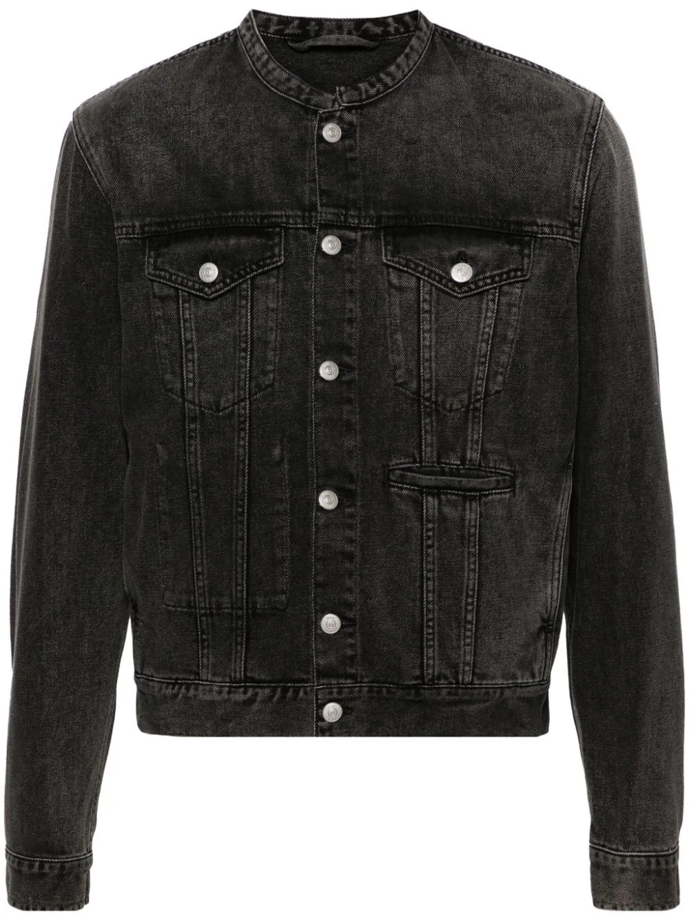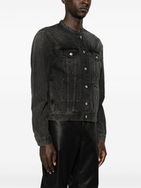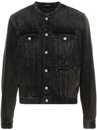 collarless denim jacket Highlights - Grey - Cotton - Denim - Signature single-stitch logo - Seam detailing - Collarless - Front button fastening - Long sleeves - Buttoned cuffs - Two chest flap pockets - Front welt pocket - Two side welt pockets - Waist tabs - Straight hem Made in Italy Composition Cotton 100% SIZE & FIT Model measurements Height 6 ft 2 in(1.87 m) Bust/Chest 36.41 in(92.5 cm) Hips 37 in(94 cm) Waist 29.52 in(75 cm) FittingInformation Designed for a slim fit, offering a comfortable fit that sits just away from the body The adjustable tabs allow for fitted preferences Sturdy and hard-wearing, this denim piece offers no stretch This piece fits true to size – take your usual size