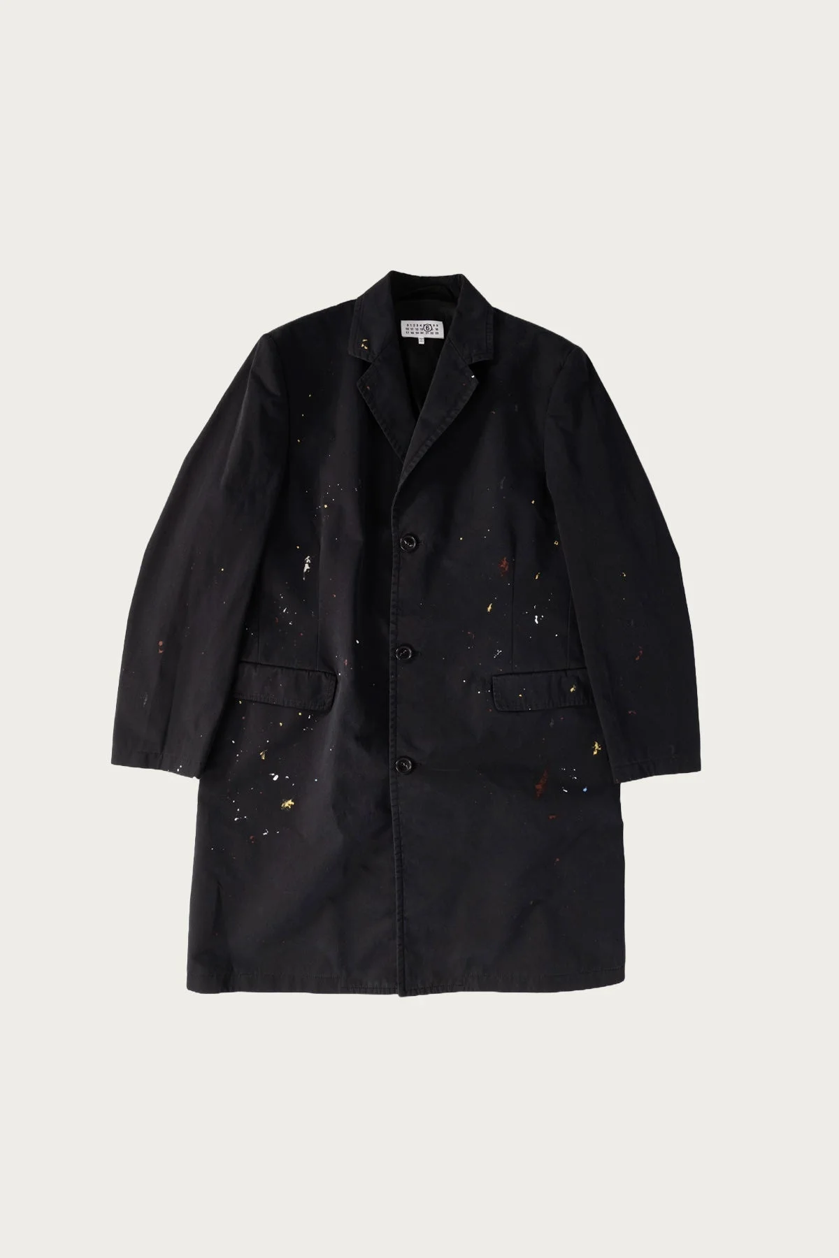 Crafted in cotton gabardine, this jacket pairs sharp tailoring with authentic painterly touches. These traces of paint suggest an ongoing creative process, while the white stitch line at the back subtly ties it to MM6’s deconstructed identity. A reimagined classic with an unexpected edge. - Primary Fabric: 100% Cotton - Lining: 100% Viscose-Rayon - Pocket Lining: 100% Cotton - Cotton gabardine trench coat - Handpainted colour splatter - Notch lapel - Single-breasted button closure - Flap pockets - Backslit - White stitch line at the back - Made in Italy - Black