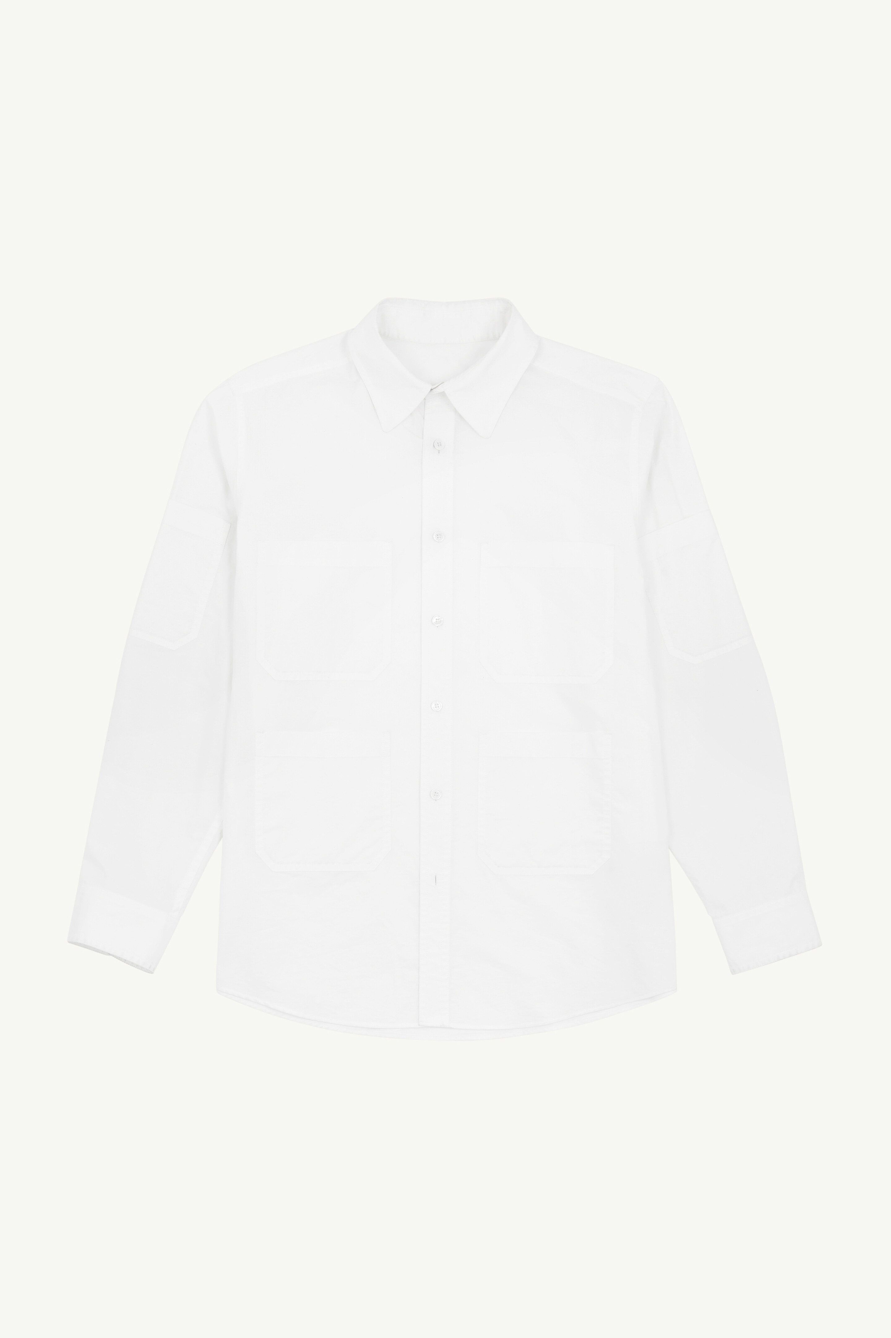 Cut from cotton poplin, MM6 adds a twist to the traditional shirt by adding side slits and a curved hem. The style is detailed by a pointed collar, button closure, buttoned cuffs and patch pockets. The brand’s discreet yet distinct signature, a horizontal line of white stitches is found on the back of the garment. Product Details Item ID SH2DT0004S47294101 Model is 188 cm tall and wears a size 48.