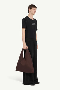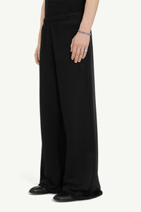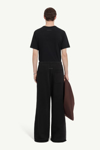 These jersey trousers are shaped with an exaggerated wide leg, grazing the floor for maximum impact. The elasticated waistband offers quiet contrast, while the single back pocket adds an offbeat utility note. MM6’s signature white stitch line marks the back in a subtle, subversive statement. Product Details Item ID SH0KA0057M25025900 Primary fabric: 100% Cotton Wide leg pants in 100% cotton fabric Wide-leg silhouette Elastic waistband Single patch pocket, right back Raw edge hemline Subtle logo/number graphic, front Visible seam stitching, sides Visible seam stitching, inner legs White stitch line at the back Model is 190 cm tall and wears a size 48.