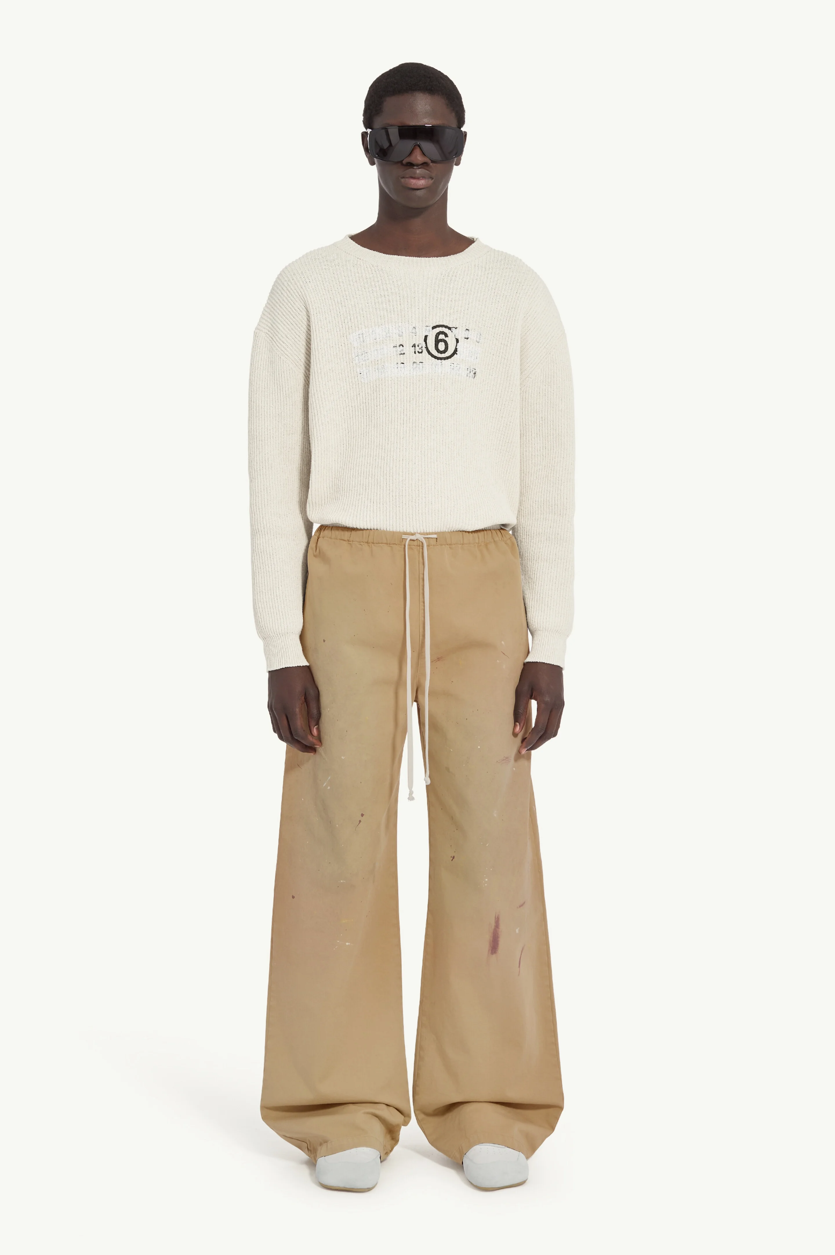MM6 distils everyday ease into a smarter form with these relaxed trousers. The shoelace tie evokes subtle utilitarian roots, while the white stitch line and numeric artwork at the back reinforce the Maison’s approach to blending comfort with contemporary sophistication. Product Details Item ID SH2KA0030M35435124 Primary Fabric: 100% Cotton Pocket Lining: 100% Cotton Cotton gabardine trousers MM6 numeric signature embroidery Regular waist Drawstring closure Side pockets Straight leg Handmade painted treatment White stitch line at the back Made in Italy