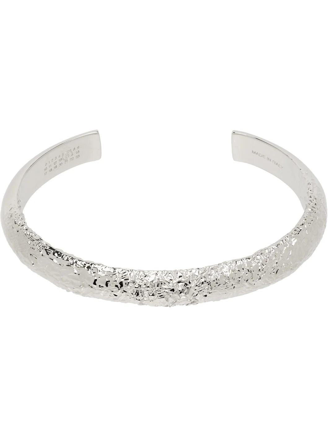 Open-cuff bracelet in silver-tone brass. · Textured detailing at face · Engraved logo and hallmarking at inner cuff Supplier color: Brushed Palladio Brass. Made in Italy 261188M142009