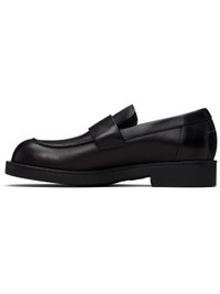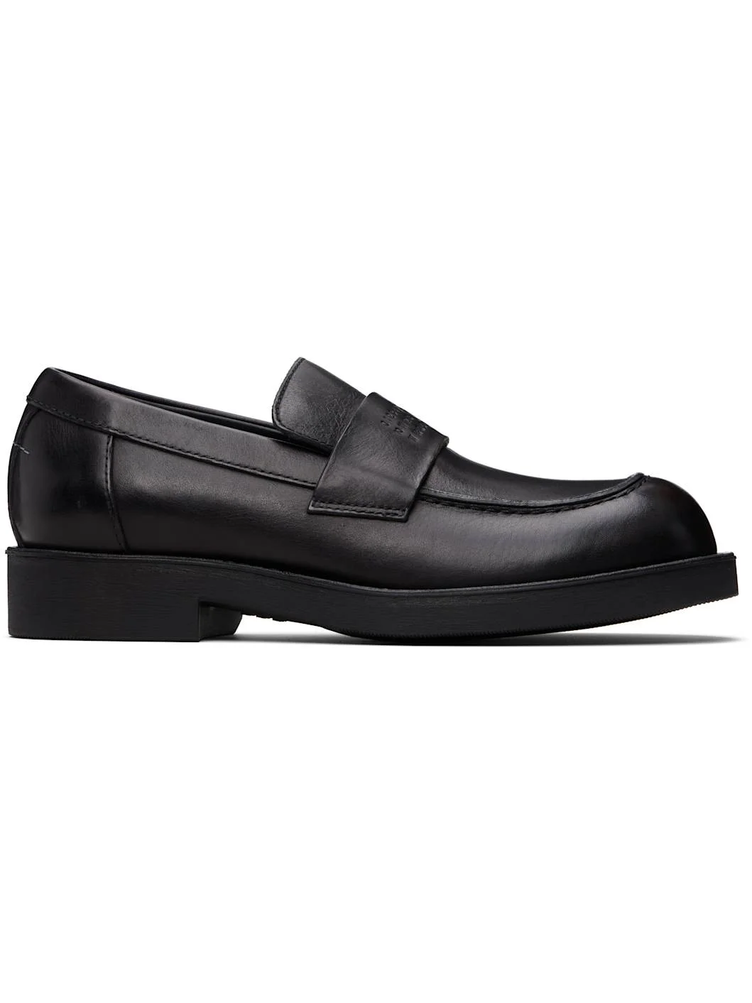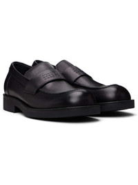 Buffed calfskin loafers. · Moc toe · Strap with embossed logo at vamp · White stitching at heel collar · Buffed calfskin lining · Foam rubber block heel and midsole · Treaded rubber sole Supplier color: Black Upper: calfskin. Sole: rubber. Made in Italy 261188M231004