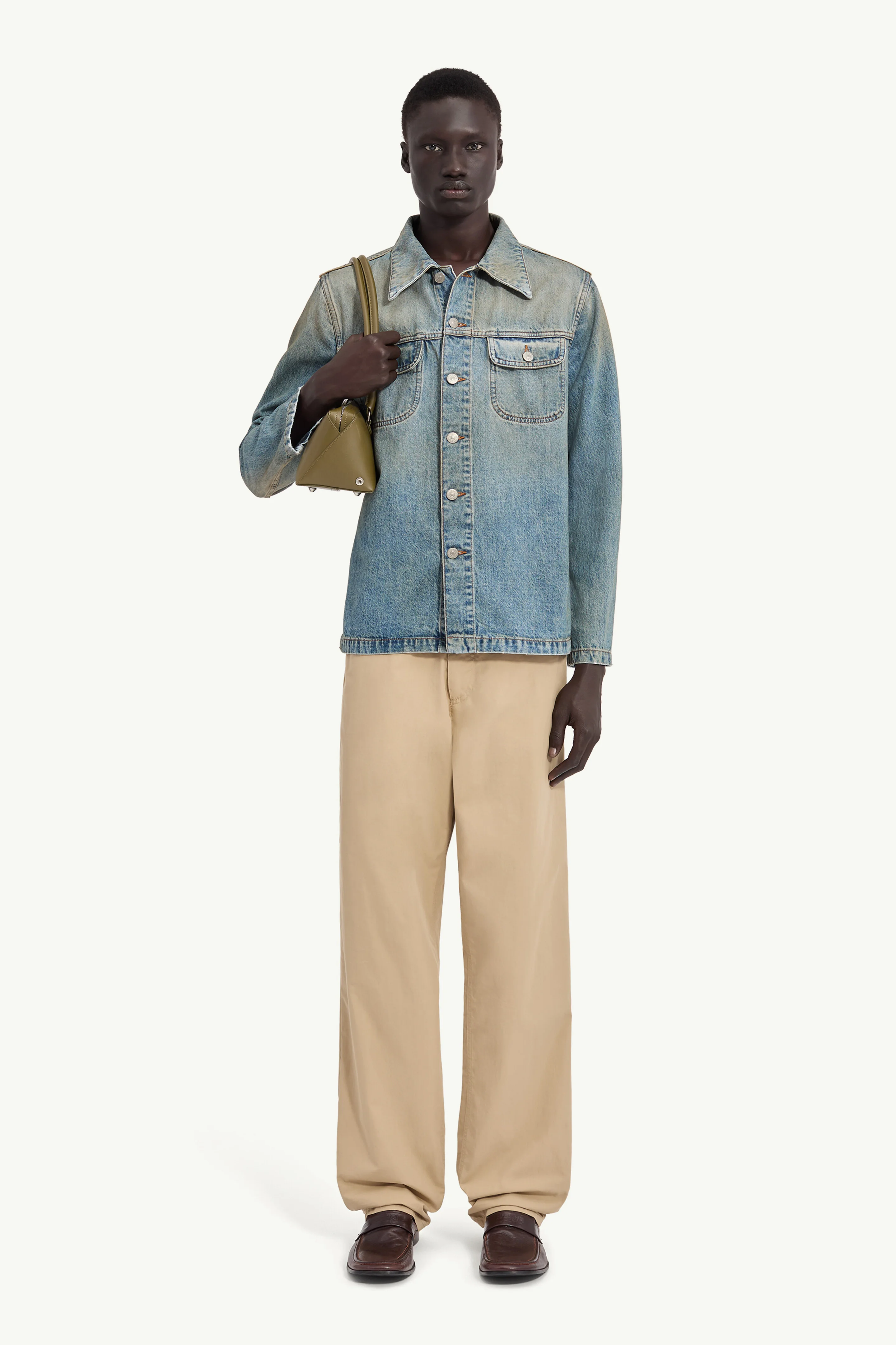 This denim jacket reworks a classic trucker silhouette. Subtle fading softens the surface while chest pockets and a button front keep the aesthetic familiar. The back is defined by arched seam lines that introduce a utilitarian feel. At the back, the MM6 white stitch line marks the Maison’s signature. Product Details Item ID SH2AM0057M30055964 Primary fabric: 100% cotton Lining: 65% polyester 35% cotton Denim 11 oz Long sleeves Shirt collar Center button closure White stitch line at the back Made in Italy