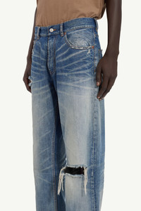 These blue denim, 5-pocket jeans quietly challenge traditional norms with a distressed twist. Together with belt loops for everyday functionality, their straight leg fit offers timeless appeal. At the back, the white stitch line and MM6 numeric artwork subtly reinforce the Maison's signature. Product Details Item ID SH0LA0019M30016961 Primary fabric: 100% cotton Pocket lining: 65% polyester, 35% cotton Blue denim 5-pocket trousers Regular waist Belt loops Straight leg Zip and button closure White stitch line at the back and MM6 numeric signature jacron label at the back Made in Italy