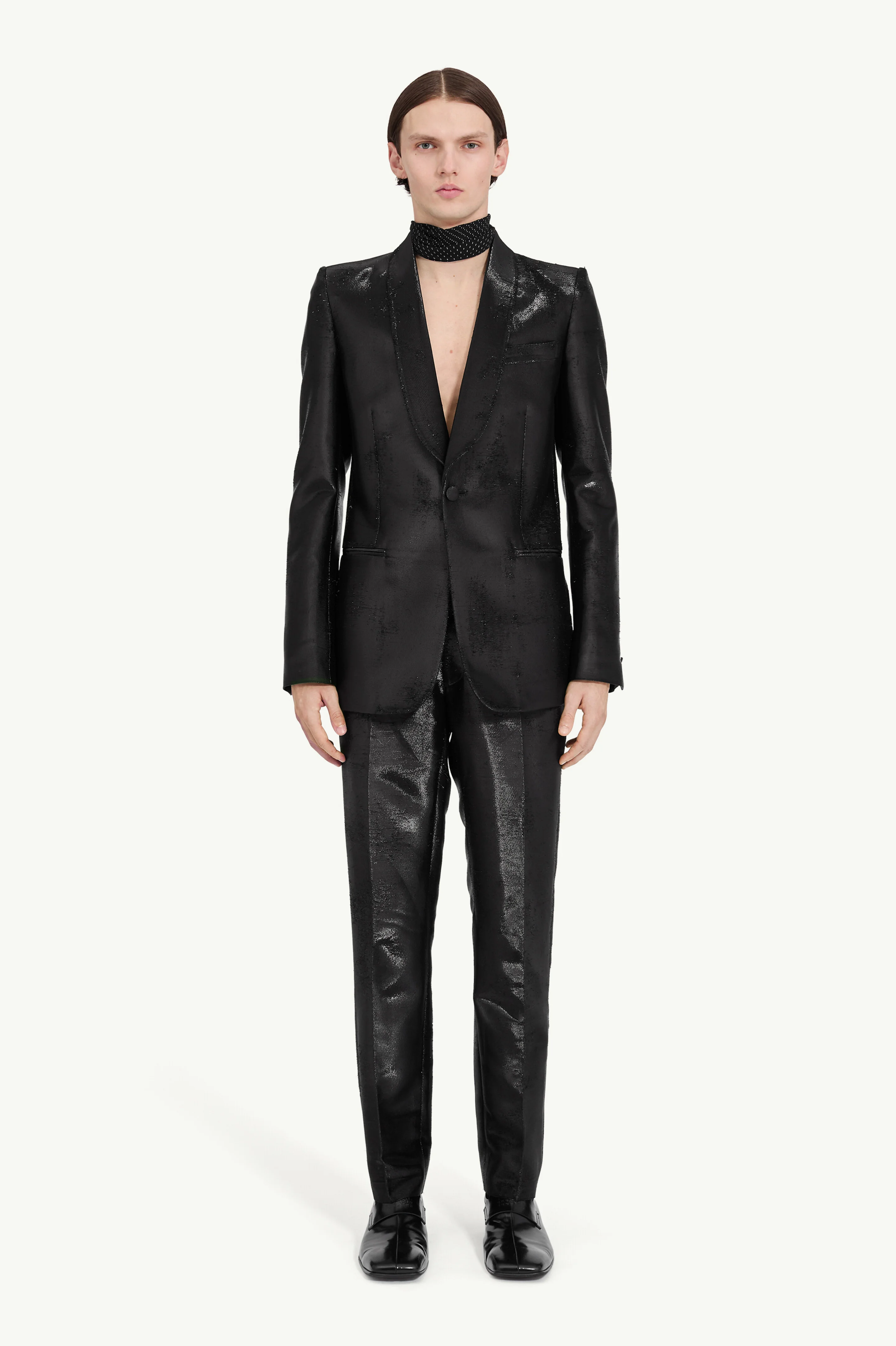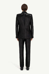 Inspired by garments found in Miles davis' wardrobe, this tailored blazer channels the energy of stagewear. A shawl lapel and single-button fastening reference the classic tuxedo, while the fabric’s sheen evokes movement. At the back, a horizontal white stitch line recalls MM6’s discreet yet distinct signature. Product Details Item ID SH2BN0015M35610900 Primary fabric: 52% acetate, 32% cotton, 16% polyester Single-breasted blazer in metallic-effect finish Shawl lapel Single-button fastening Welt pockets and chest pocket Lightly padded shoulders Back vent Made in Italy Model is 186 cm tall and wears a size 48.