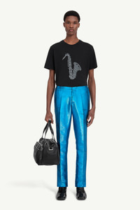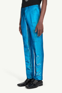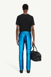 With their high-shine finish and structured cut, these metallic-effect trousers reference the showmanship of jazz-era style. The electric palette and textured sheen echo the boldness of Miles Davis’ performance looks. At the back, the MM6 white stitch line underscore their identity. Product Details Item ID SH2KA0036M35610519 Primary Fabric: 52% Acetate Secondary Fabric: 32% Cotton Tertiary Fabric: 16% Polyester Straight-leg metallic trousers Tailored waistband with concealed closure Pressed creases at the front and back Welt pocket at the back Made in Italy Model is 190 cm tall and wears a size 48.