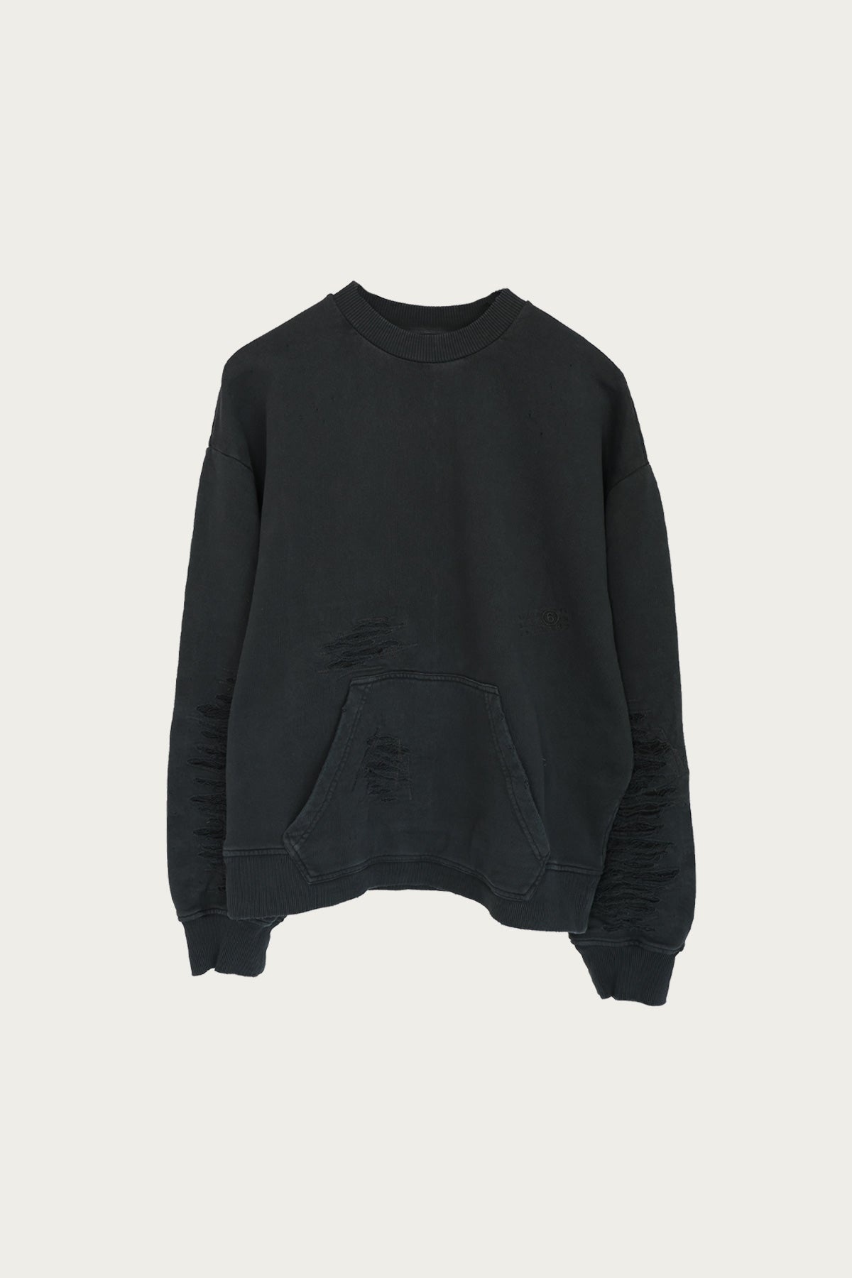 This Distressed Numbers Crewneck is a must-have for any wardrobe. Made from 100% cotton, it offers both style and comfort. The dark gray color adds a touch of edginess, while the distressed details give it a unique, worn-in look. The MM6 logo stitched on the front adds a subtle yet stylish touch. Upgrade your wardrobe with this versatile and on-trend piece. - 100% Cotton - Distressed - Embroidered logo on front - Dark Gray