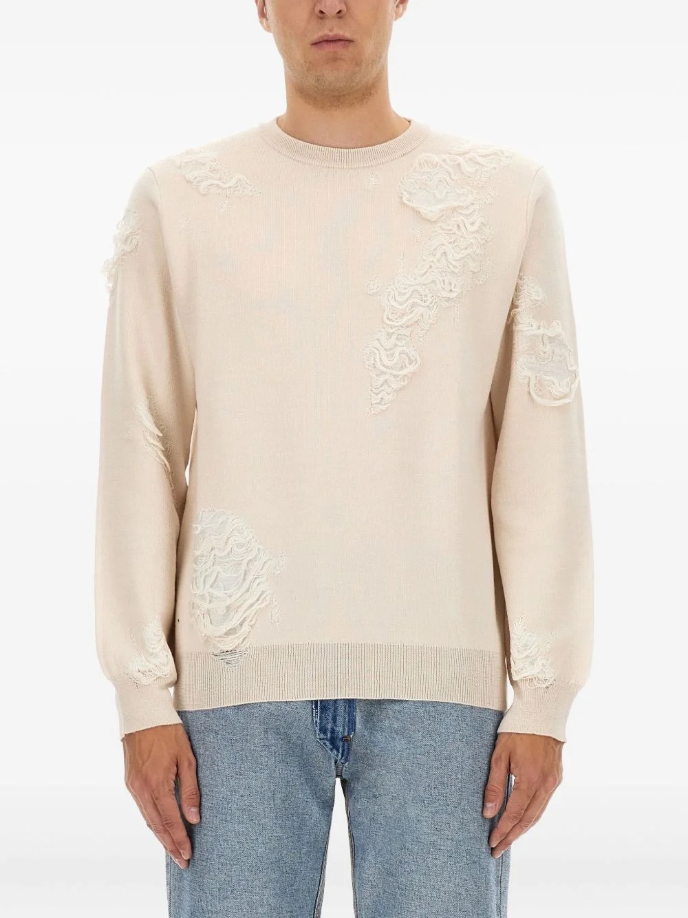 distressed sweater Highlights - Off-white - Distressed detailing - Round neck - Long sleeves - Ribbed hem Imported Composition Wool 80%, Polyamide 20% Washing instructions Read Manufacturer Guidelines
