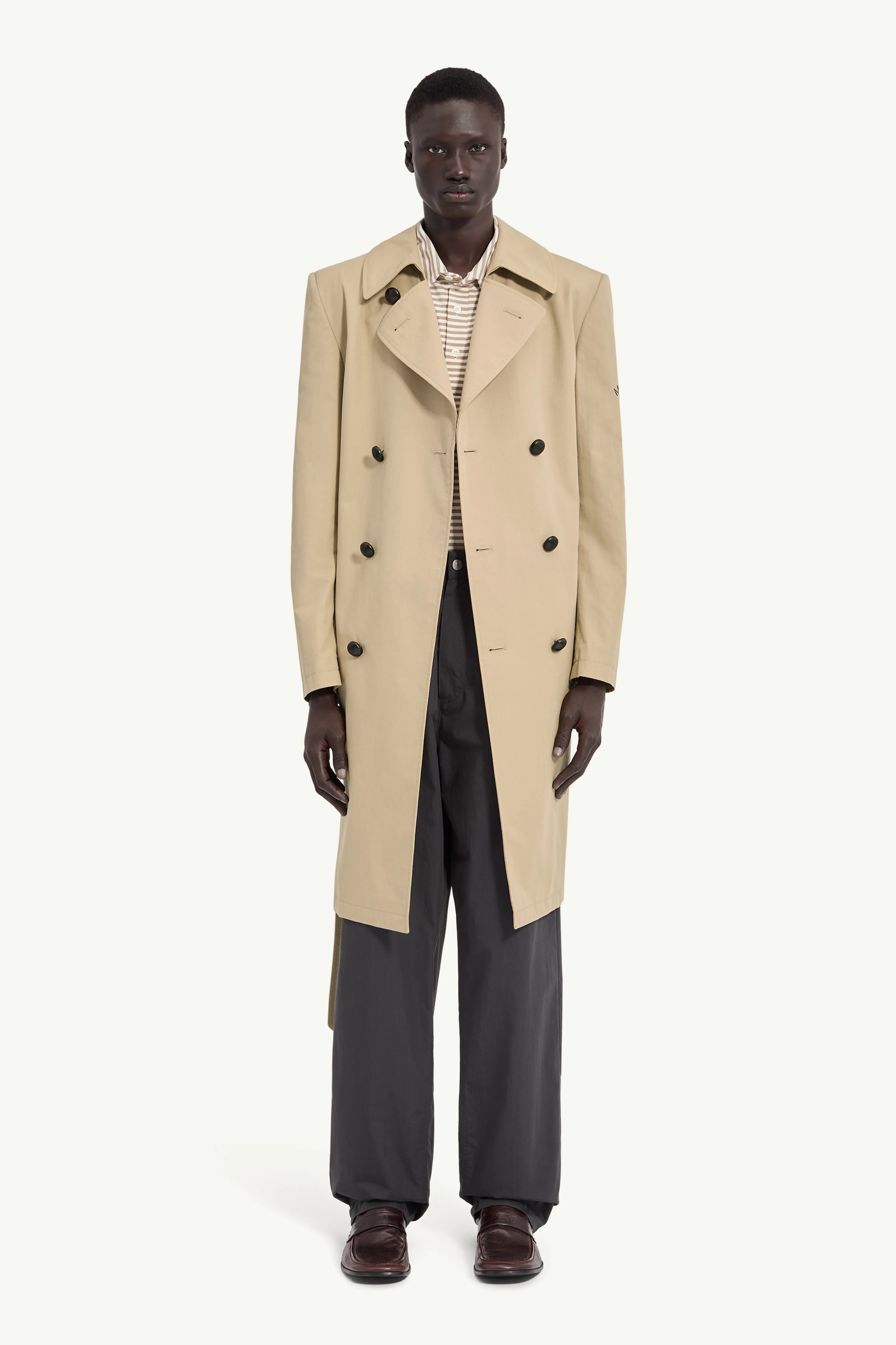 A double-breasted trench coat with a belted waist, structured collar and buttoned front, balanced by slip pockets and a storm flap at the back. A printed MM6 numeric signature appears at the sleeve, adding a graphic interruption to the classic form. Finished with the MM6 white stitch line at the back. Product Details Item ID SH2AH0018M35858115