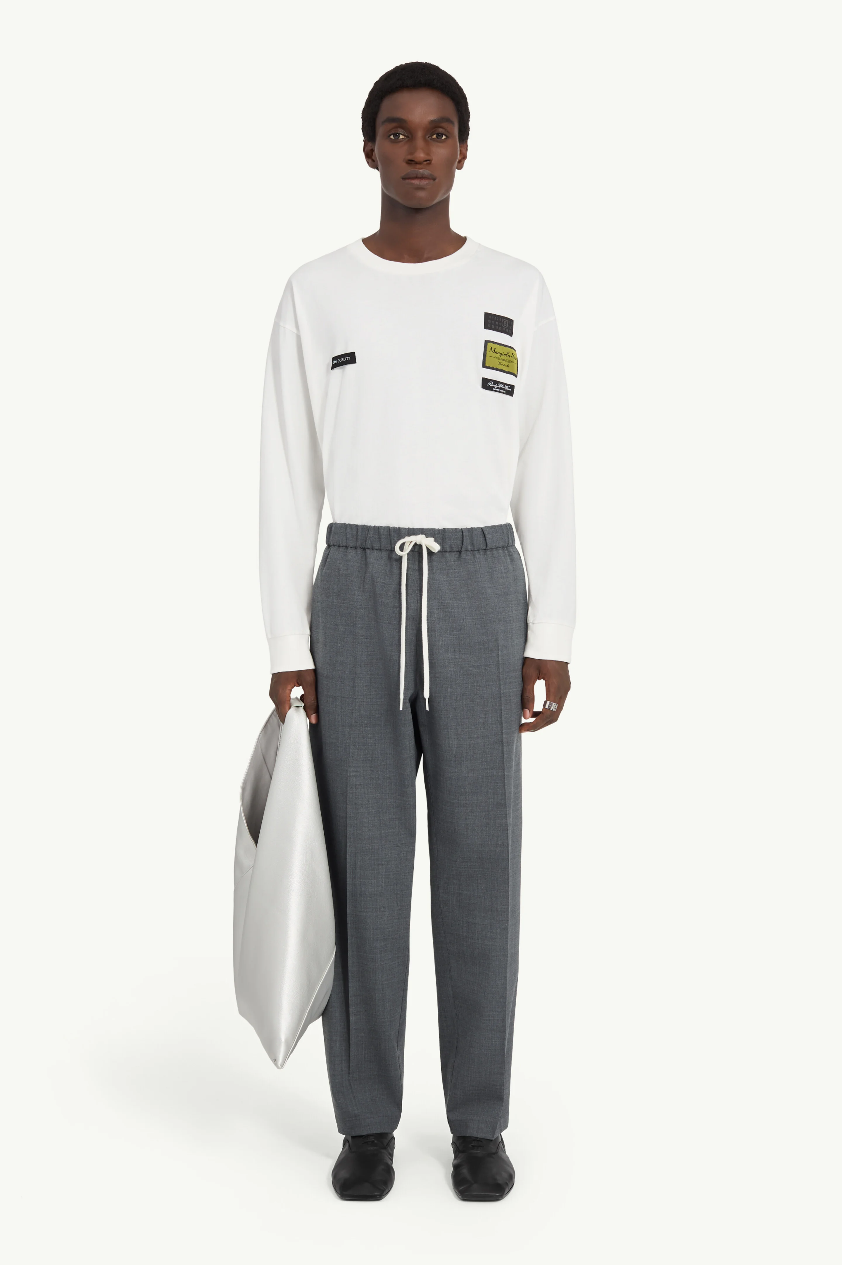 Relaxed proportions meet precision tailoring in these wool blend trousers. Defined by an elasticated waistband with contrast drawstring, they balance ease with structure, offering a modern approach to suiting. At the back, the Maison’s signature white stitch line asserts its quiet mark of identity. Product Details Item ID SH0KA0028M35733860M Primary fabric: 54% polyester 44% wool 2% elastane-spandex Pocket lining: 100% cotton Full-length wide-leg pants Drawstring and elasticized waistband closure White stitch line at the back Made in Italy