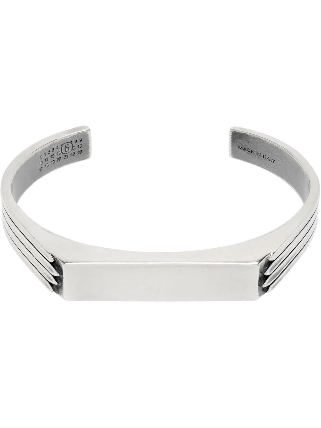 Open cuff bracelet in antiqued silver-tone brass. · Engraved detailing at sides · Logo engraved at base and inner cuff Supplier color: Brunito Brass. Made in Italy 252188M142014
