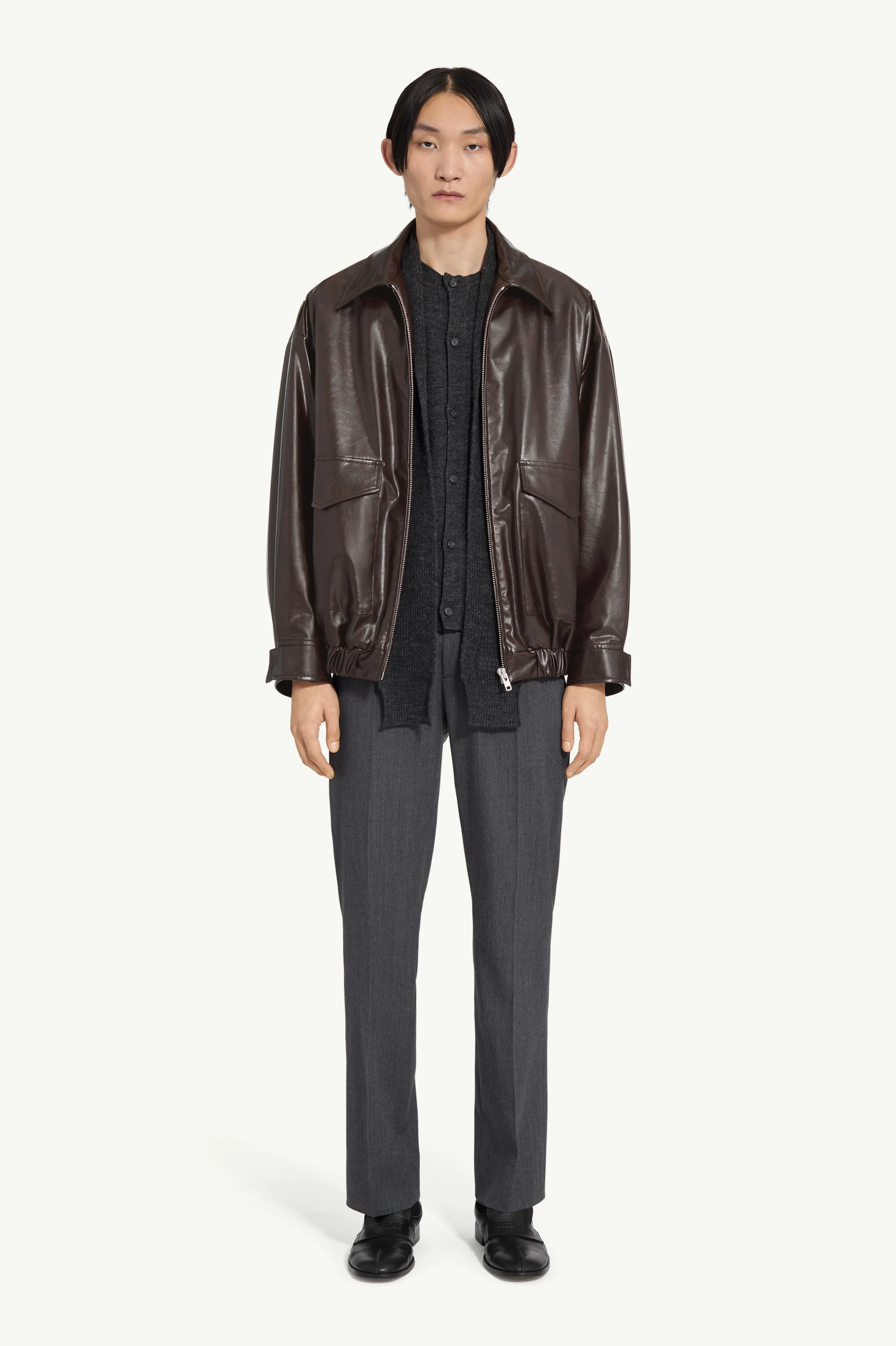 This clean-lined jacket plays with structure through gentle exaggeration. The oversized cut is tightened at the hem with gathered detailing. Wide flap pockets interrupt the smooth front, while the sleeves taper softly to buckled cuffs – an understated nod to the idea of utility undone, finished with the MM6 white stitch line. Product Details Item ID SH0AM0065M35465144 Primary Fabric: 100% Viscose-Rayon Coating: 100% Polyurethane Padding: 100% Polyester Lining: 100% Viscose-Rayon Pocket Lining: 100% Cotton Bomber jacket with a leather-effect finish Elasticated hem Pointed collar Zip fastening Deep flap pockets at the front White stitch line at the back Made in Italy Model 1 is 179 cm tall, model 2 is 190 cm tall and wears a size 48.
