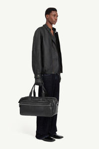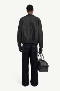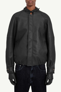 This high-neck jacket draws on aviator tradition through a clean, engineered silhouette. Defined by tonal stitching, a curved back yoke and a buckle-fastened collar, the form is precise yet softly rounded. Elasticated edges lend structure without rigidity, while a white stitch line affirms MM6’s quiet signature at the back. Product Details Item ID SH2AM0053M35455900 Primary fabric: 100% Polyester, 100% Polyurethane Secondary fabric: 100% Viscose-Rayon, 100% Polyester, 100% Cotton Flight-style jacket with stand collar Buckle tab fastening at the neck Concealed zip front with snap button at the top Elasticated hem Side welt pockets White stitch line at the back Made in Italy