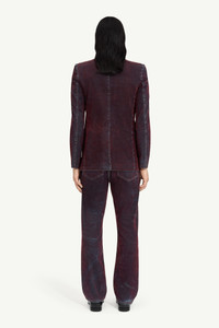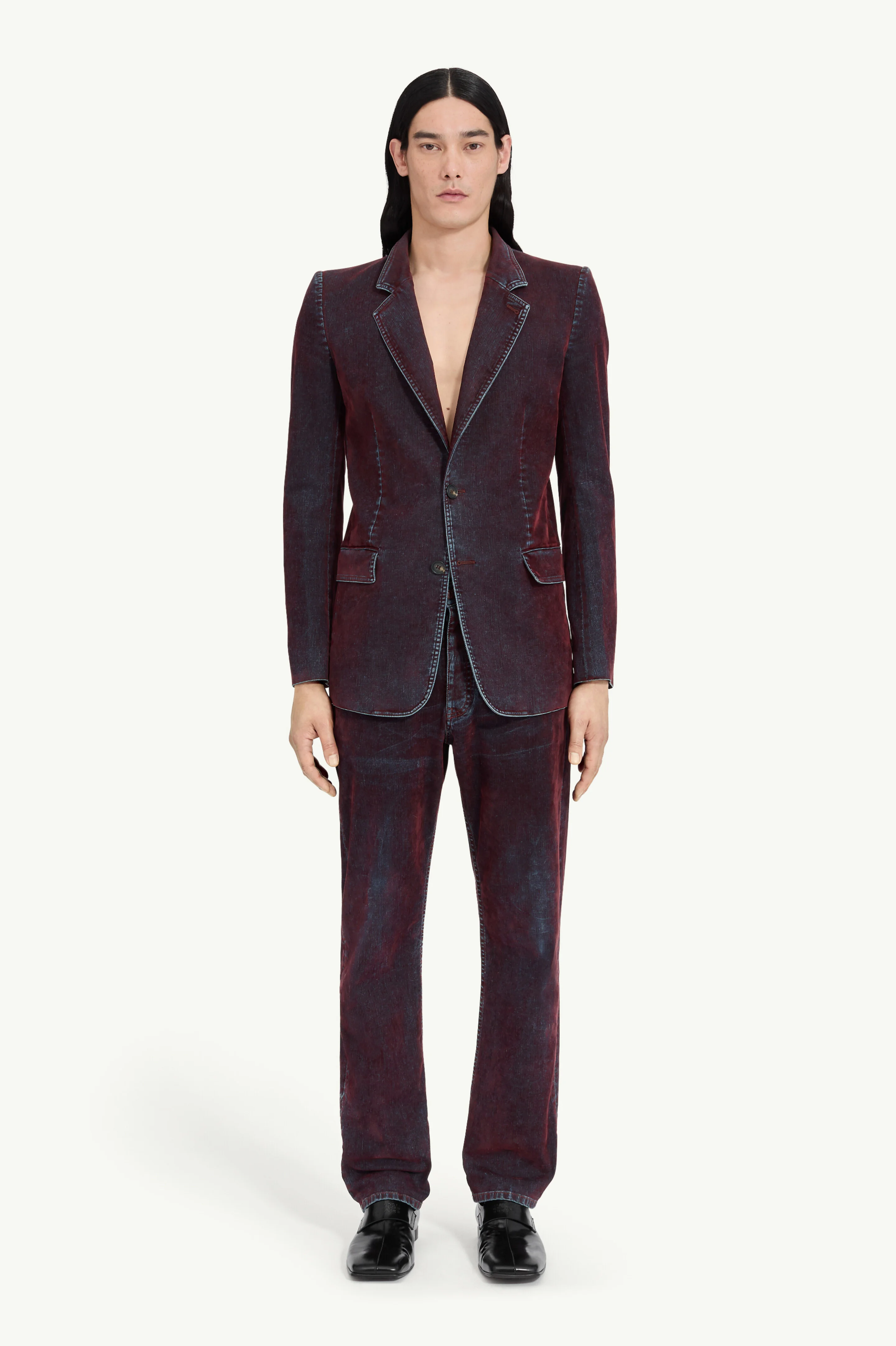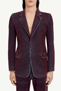 This single-breasted jacket blends sharp structure with subcultural edge. The denim-effect coating reveals subtle signs of wear, infusing the formality of suiting with a distinctly lived-in finish. Faint fading and contrast topstitching trace its contours, channelling the Maison's irreverent spirit. Finished with the white stitch line at the back. Product Details Item ID SH2BN0019M30039227 Primary Fabric: 98% Cotton, 2% Elastane Secondary Fabric: 100% Viscose Fitted tailored jacket in coated stretch cotton Single-breasted front with two-button fastening Notched lapel Flap pockets Contrast stitching White stitch line at the back Made in Italy Model is 188 cm tall and wears a size 48.