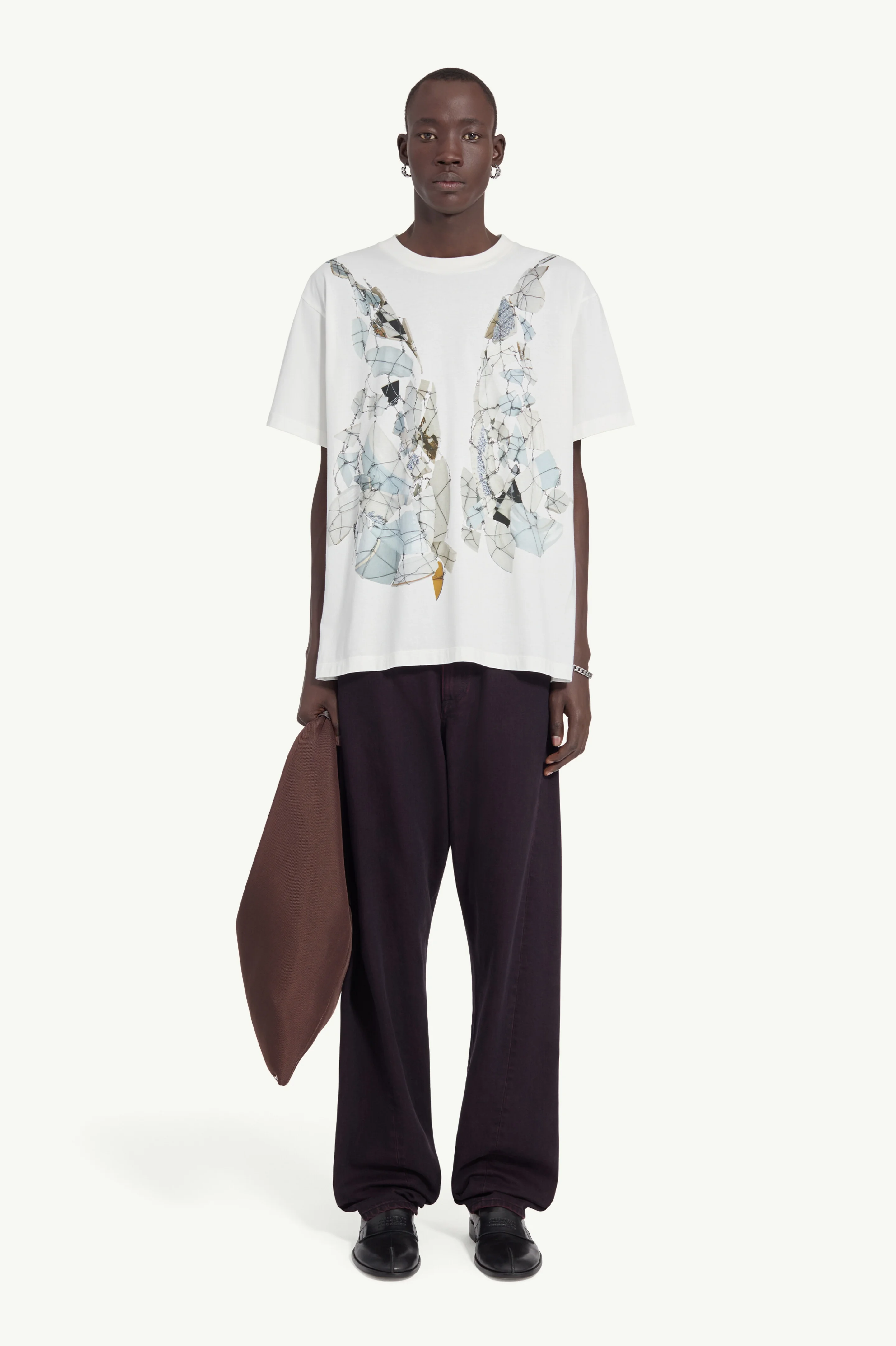 An archival motif rendered anew. This oversized T-shirt features a trompe l’oeil print of the iconic broken plate design first seen in Martin Margiela’s Fall/Winter 1989 show. The shattered illusion spreads across the chest, recalling past narratives through present forms. A single white stitch at the back echoes the Maison’s quiet signature. Product Details Item ID SH0GC0056S24312101 Primary Fabric: 100% Cotton Short-sleeved T-shirt Shattered mirror wing print at the front Crew neckline White stitch line at the back Made in Portugal Model is 188 cm tall and wears a size M.