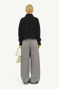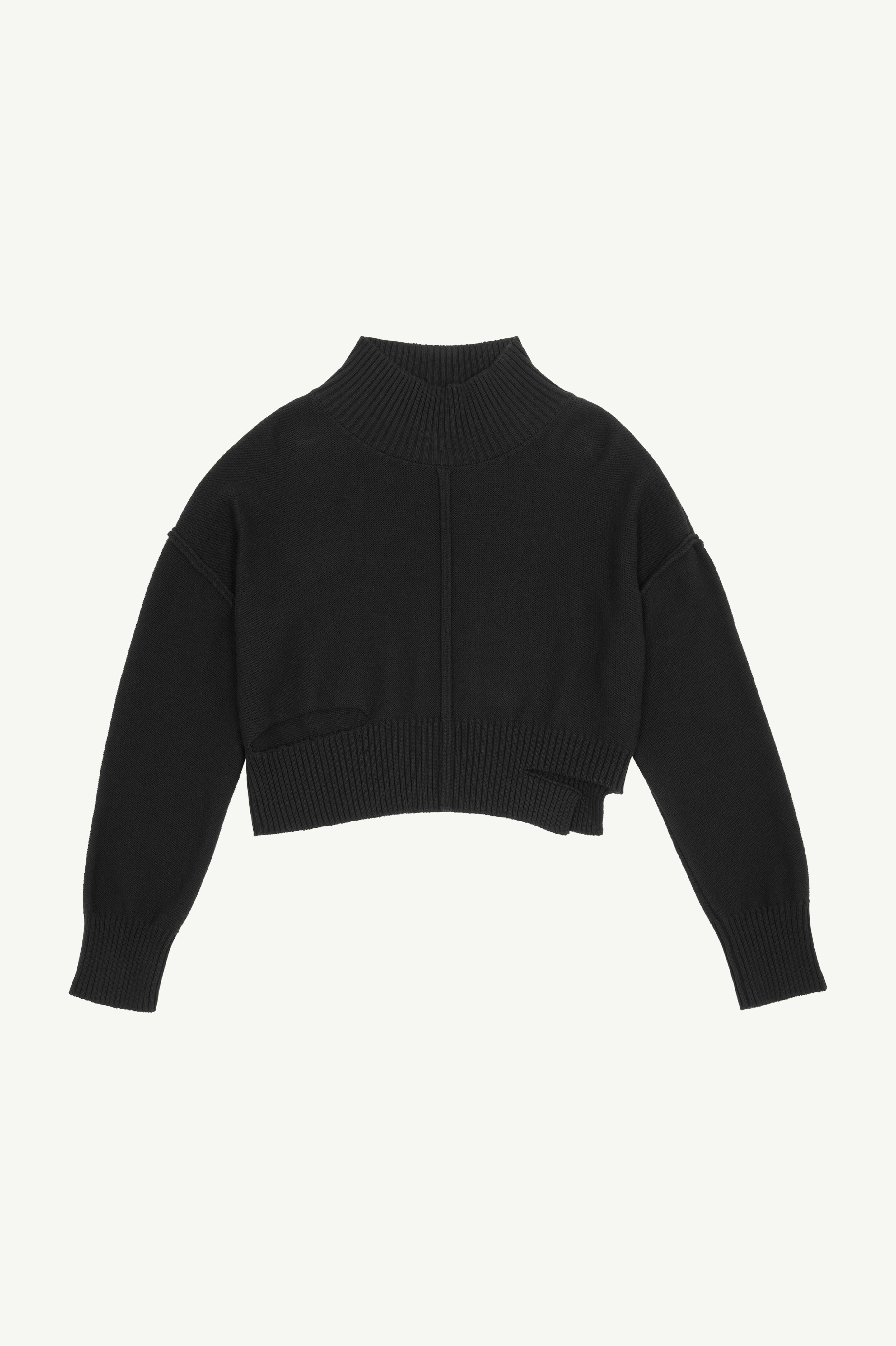 MM6’s black gauge turtleneck is crafted from cotton and features exposed seams, ribbed trims and ripped details, reflecting the label's approach to knitwear. The brand’s discreet yet distinct signature, a horizontal line of white stitches, is found on the back of the garment. Product Details Item ID S52HA0285S18444900 Composition: 85% cotton, 15% wool Gauge 7 Distressed cotton jumper Turtleneck Dropped shoulder Exposed seams Ribbed trims Ripped details White stitch line at the back Made in Italy Model is 178 cm tall and wears a size M.