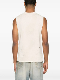 This Gilet Vest in cream by MM6 Maison Margiela is crafted from a sturdy cotton and features a distressed treatment for a unique look. Finished with a V-neck and ribbed trims, it is completed with a number logo jacquard. 75% Cotton, 20% Polyester, 5% other fibres
