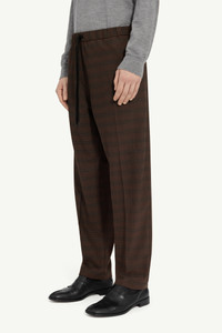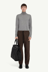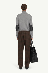 These wide-leg checked trousers offer classic tailoring with a casual feel, featuring an elasticated waistband and drawstring tie in place of formal fastenings. The relaxed fit invites movement, while the MM6 white stitch line at the back subtly asserts the Maison’s unconventional ethos. Product Details Item ID SH0KA0028M35475001F Primary Fabric: 53% Polyester 43% Virgin Wool 4% Elastane-Spandex Pocket Lining: 100% Cotton Drawstring trousers in wool-blend Elasticated waistband with drawstring Rear patch pocket and side seam pockets White stitch line at the back Made in Italy Model is 190 cm tall and wears a size 48.