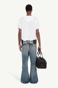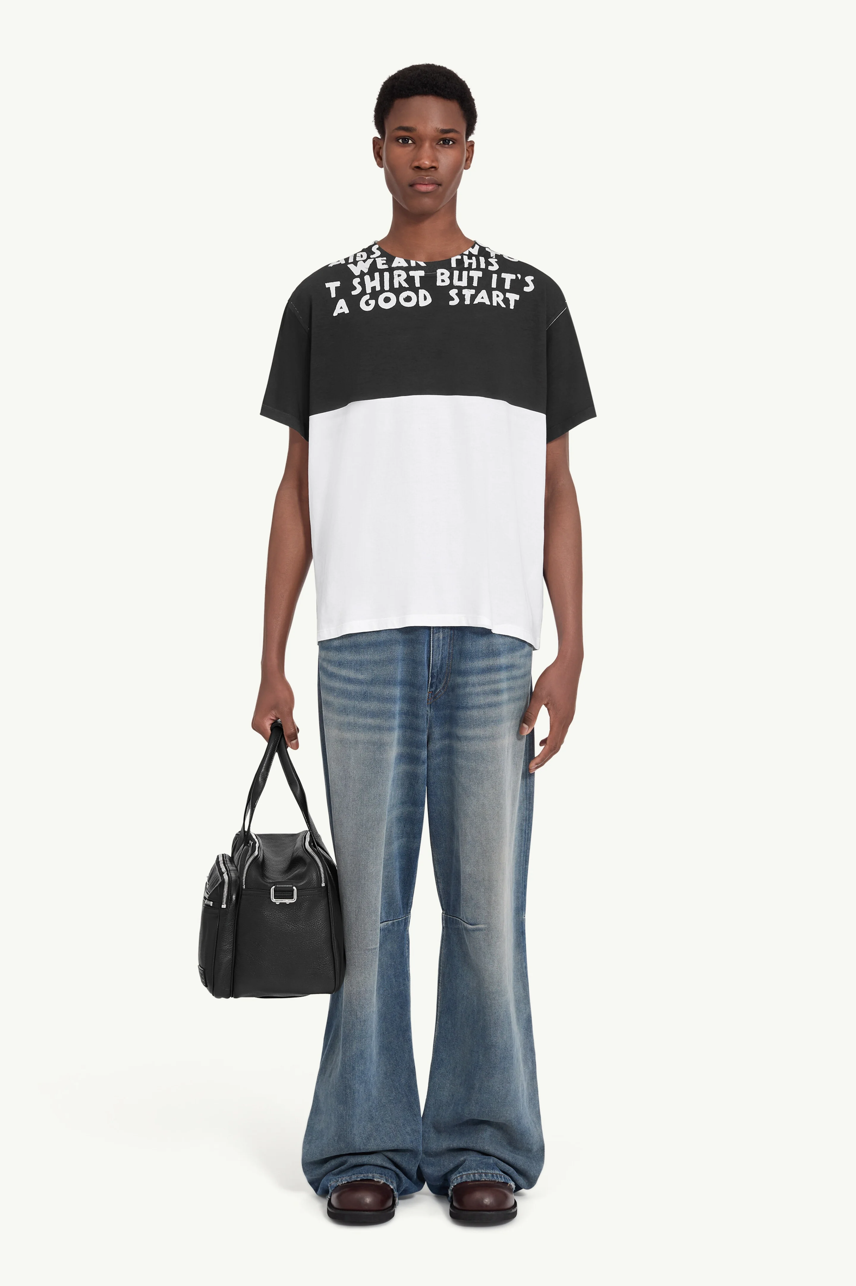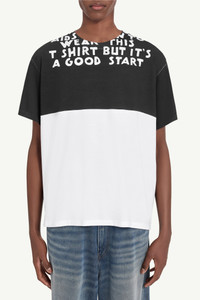 Reintroduced from the Maison’s archive, the SIDA print – first shown in Autumn/Winter 1993 – returns as a call for continued awareness in the fight against HIV and AIDS. A portion of proceeds supports AIDES, a French NGO dedicated to combating the epidemic. MM6’s white stitch line appears at the back. Product Details Item ID SH2GC0033M20048100 Primary Fabric: 100% Cotton Short-sleeved T-shirt in jersey Contrast panel design Slogan print wraps front and back Ribbed crewneck White stitch line at the back Made in Italy Model is 190 cm tall and wears a size M.