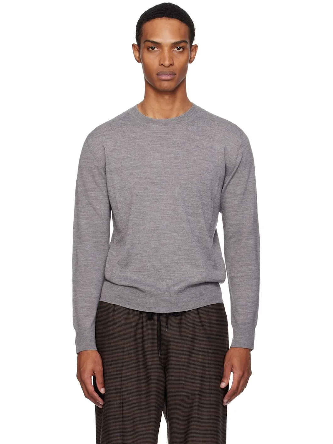 Knit virgin wool-blend sweater. · Rib-knit crewneck, hem, and cuffs · Buffed calfskin elbow patches · White stitching at back Supplier color: Grey melange Body: 50% virgin wool, 50% acrylic. Trim: 100% calfskin. Made in Romania 252188M201003