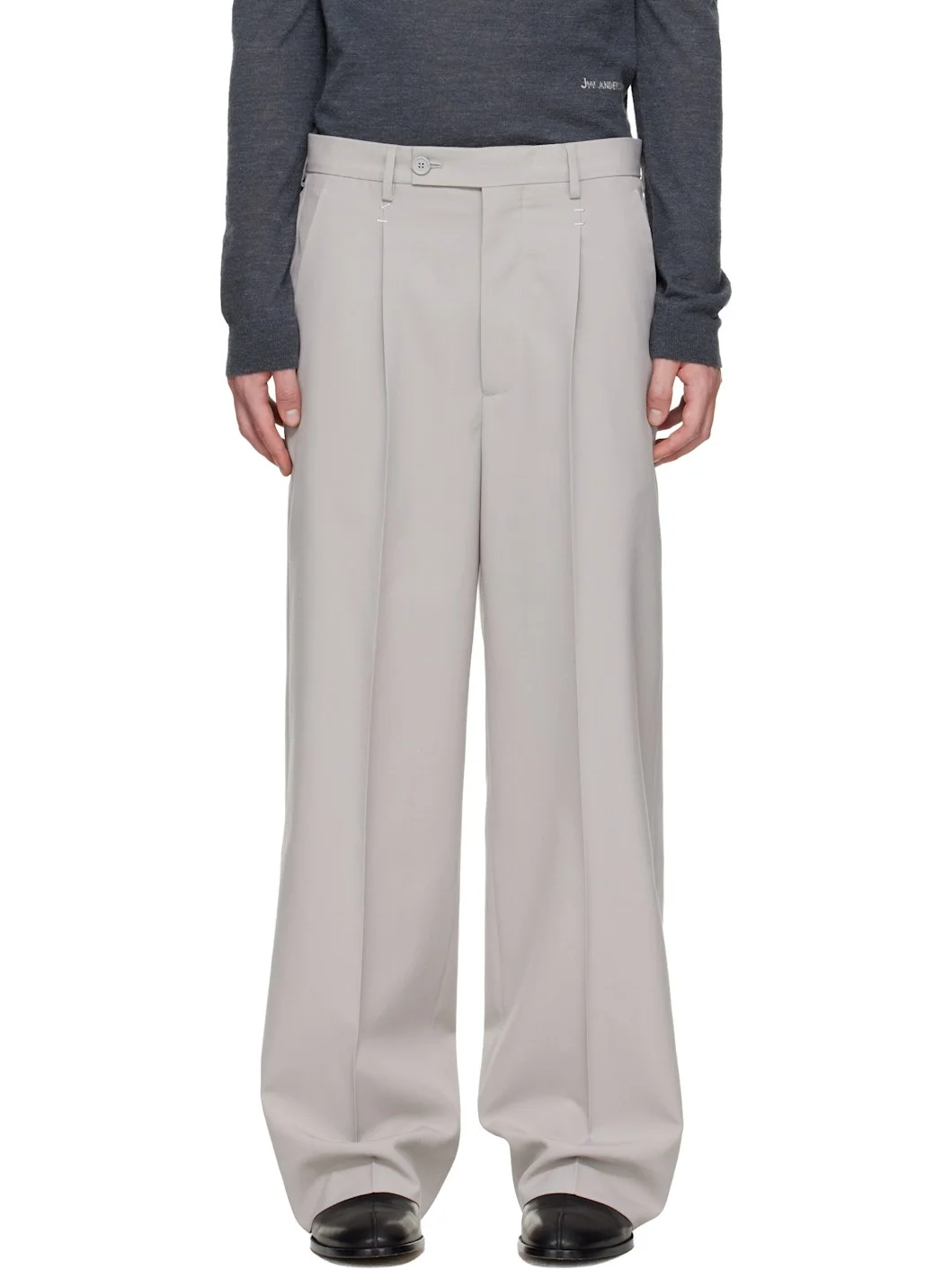 Plain-woven virgin-wool blend trousers. · Belt loops · Three-pocket styling · Zip fly · Staple hardware at front and back · Pleats at front · Creased legs · White stitching at back Supplier color: Pale grey Body: 55% polyester, 45% virgin wool. Trim: 100% cotton. Made in Italy 261188M191008