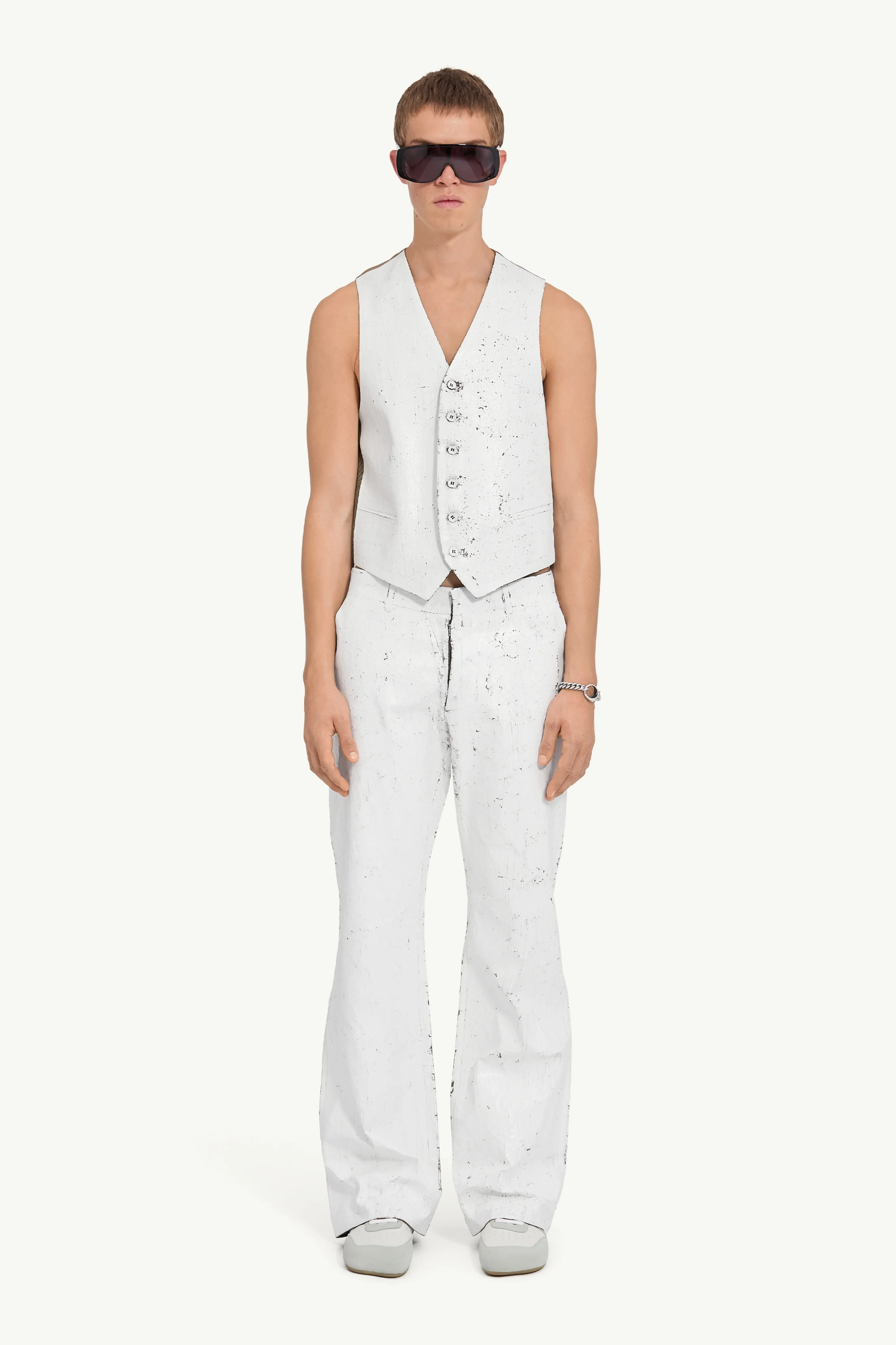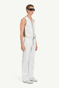 This waistcoat disrupts archetypal tailoring with its creative exploration of found garments. Inspired by MM6’s heritage and archival use of white paint, it recontextualizes familiar forms with a sense of ongoing transformation. At the back, the Maison's signature white stitch line quietly asserts its deconstructive identity. Product Details Item ID SH2FB0008M35437002F Primary Fabric: 54% Polyester 44% Virgin Wool 2% Elastane-Spandex Lining: 100% Viscose-Rayon Tailoring viscose blend gilet V-neck Single-breasted button closure Handpainted treatment at the front Adjustable back White stitch line at the back Made in Italy