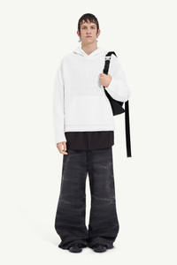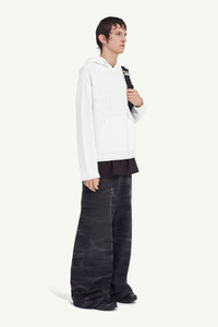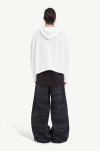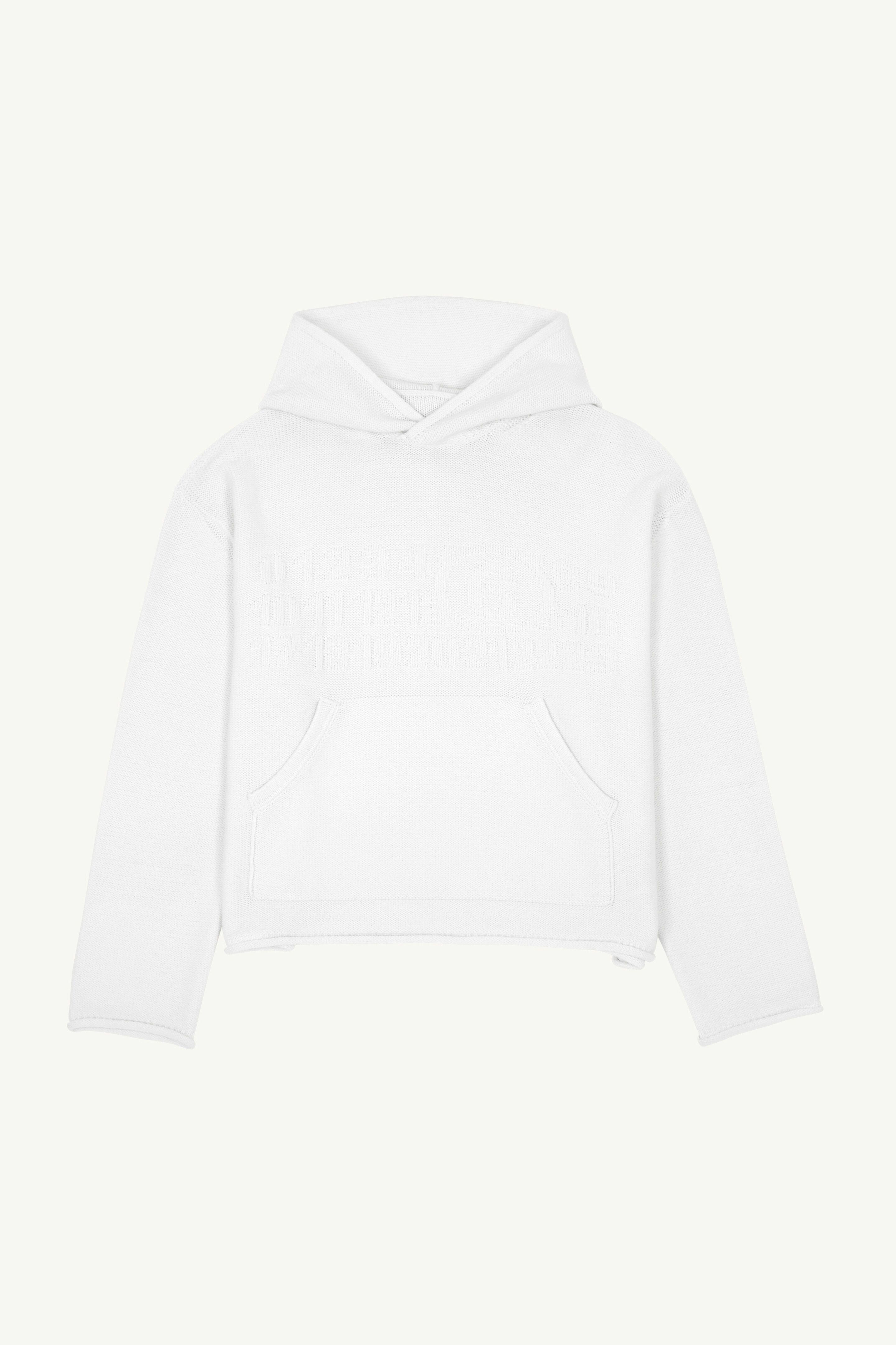 Long-sleeve knit jumper. The loose-fit hooded design features a jacquard numbers logo on the front above the kangaroo pocket. Gauge 5. Product Details Item ID S52GP0150S18286100J Composition: 70% virgin wool 30% acrylic Knitted hooded jumper Dropped shoulder MM6 numeric signature at the front Front pocket White stitch line at the back Model is 6'2" tall and wears a size S.