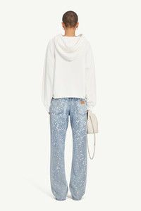 Cut from cotton jersey, this relaxed hooded sweatshirt finds edge in the details. A raw-cut hem contrasts with the soft structure, while a kangaroo pocket and dropped shoulders add ease. Finished with the MM6 numeric artwork at the chest and the white stitch line at the back. Product Details Item ID S62GU0142M25024101 Primary fabric: 100% Cotton Drawstring hood Dropped shoulders Long sleeves Kangaroo pocket Raw-cut hem MM6 numeric artwork at the chest White stitch line at the back Model is 180 cm tall and wears a size M.
