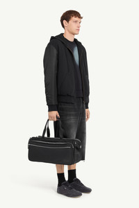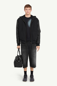 This zip-up hooded sweatshirt is cut in brushed sweat with padded nylon sleeves for contrast and volume. A drawstring hood and kangaroo pocket emphasise its casual character, while the sleeve zip pocket recalls utility design. At the back, the MM6 white stitch line marks its signature. Product Details Item ID SH0AM0075MTJ043961 Primary fabric: 66% cotton 34% polyester Secondary fabric: 100% polyamide-nylon Lining: 100% viscose-rayon Padding: 100% polyester Brushed light sweat and nylon mix Long sleeves Hooded neckline Front zipper closure White stitch line at the back Made in Italy