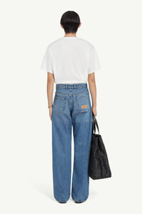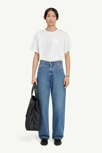 These wide-leg jeans introduce subtle disruption through a horizontal seam slicing across the back leg. The rear patch pocket is flipped upside down, echoing the inverted numeric artwork – a quiet defiance of conventional construction. At the back, the MM6 white stitch line highlights its signature. Product Details Item ID SH0LA0023M30018967 Primary Fabric: 100% Cotton Pocket Lining: 65% Polyester 35% Cotton Wide-leg denim jeans Belt loops Five-pocket construction Inverted patch pocket at the rear Horizontal seam detailing at the back leg Numeric signature label White stitch line at the back Made in Italy Model is 190 cm tall and wears a size 32.
