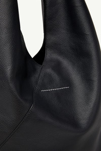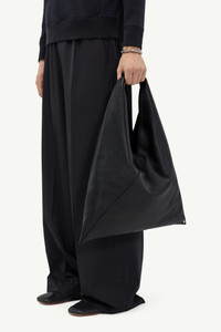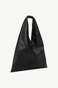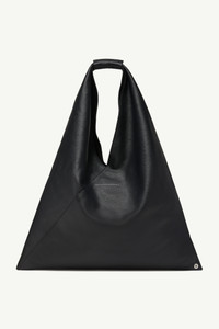 Japanese bag in grained leather. First introduced as part of the Autumn-Winter 2009 collection, the Japanese bag has since become MM6’s most emblematic accessory. Its distinctive triangular silhouette is inspired by the Japanese art of paper folding, origami. The buttons at its edges allow for the bag to change form through folding, evoking the Maison’s deconstructionist design codes. Each season, the Japanese bag is reinterpreted in additional sizes and a variety of innovative fabrics, rendering the accessory timeless. Product Details Item ID S54WD0039P4344T8013 Body: 100% calf leather Lining: 100% cotton Medium handbag in grainy leather MM6 numeric signature cuff Two snap buttons at the edge to change the shape White stitch line at the back Button closure Inside pocket with button closure Height: 55 cm Width: 2 cm Length: 50 cm Handle drop: 20 cm Clean with a gentle cleanser and a damp microfiber cloth