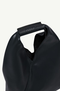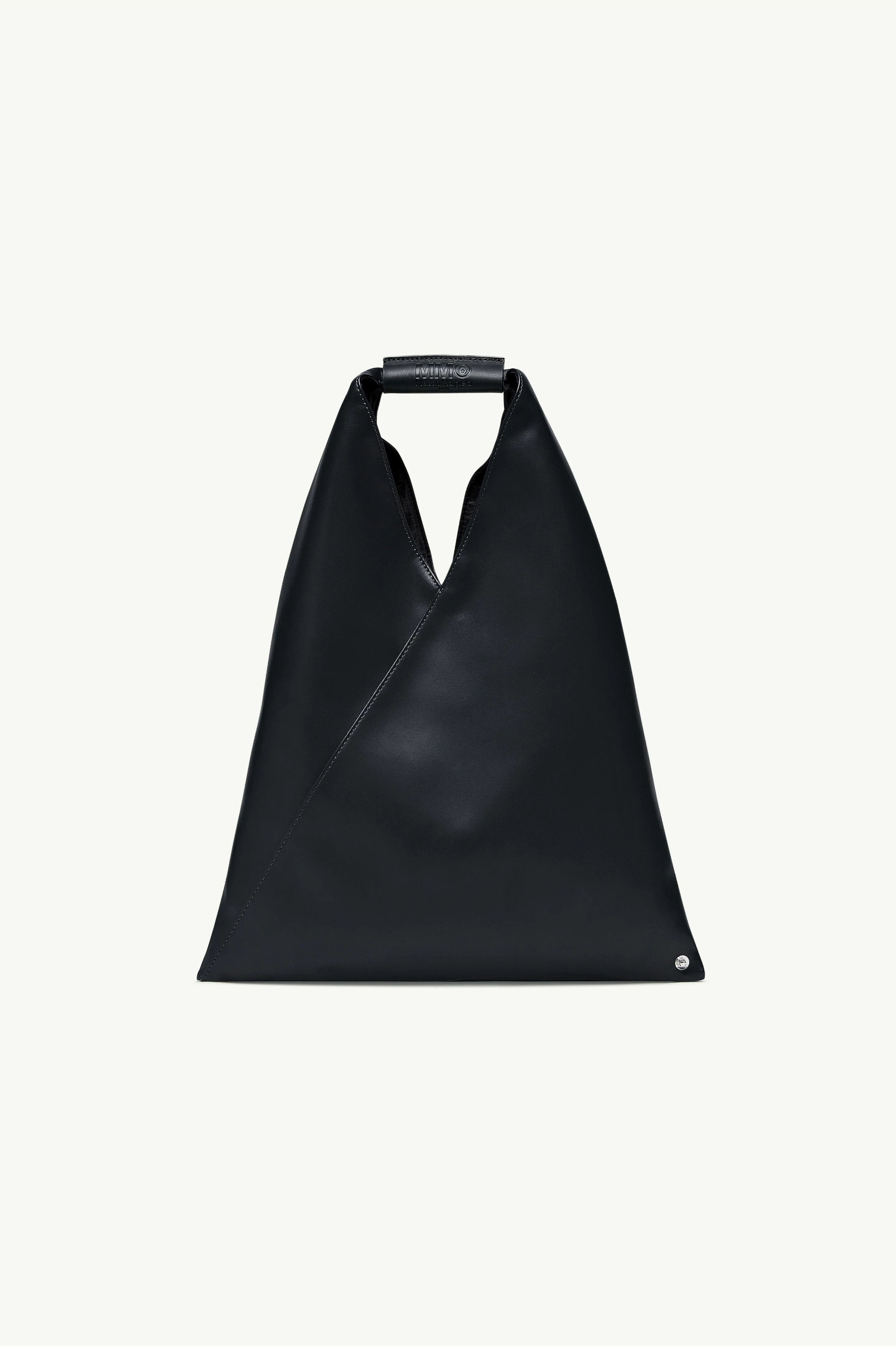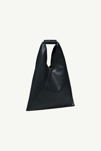 Japanese bag classic small in PU leather. First introduced as part of the Autumn-Winter 2009 collection, the Japanese bag has since become MM6’s most emblematic accessory. Its distinctive triangular silhouette is inspired by the Japanese art of paper folding: origami. The buttons at its edges allow for the bag to change form through folding, evoking the Maison’s deconstructionist design codes. Each season, the Japanese bag is reinterpreted in additional sizes and a variety of innovative fabrics, rendering the accessory timeless. Product Details Item ID S54WD0043P4313T8013 Body: 60% Polyester, 40% Polyurethane Contrast: 100% Calf Leather Lining: 100% Polyester Metallic Parts: 100% Copper Handbag in leather-effect finish Soft triangular silhouette Top handle debossed with numeric signature White stitch line at the back