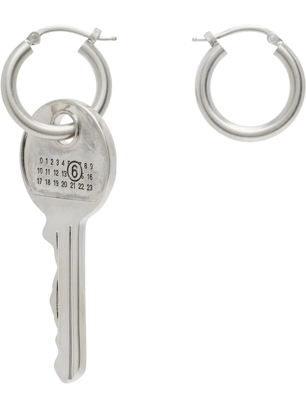 Pair of mismatched drop and hoop earrings in antiqued silver-tone brass. · Logo-engraved key charm at drop · Hinged-post fastening · D0.75"; H2.75" x W0.75" Supplier color: Glazed palladium Brass. Made in Italy 261188M144010