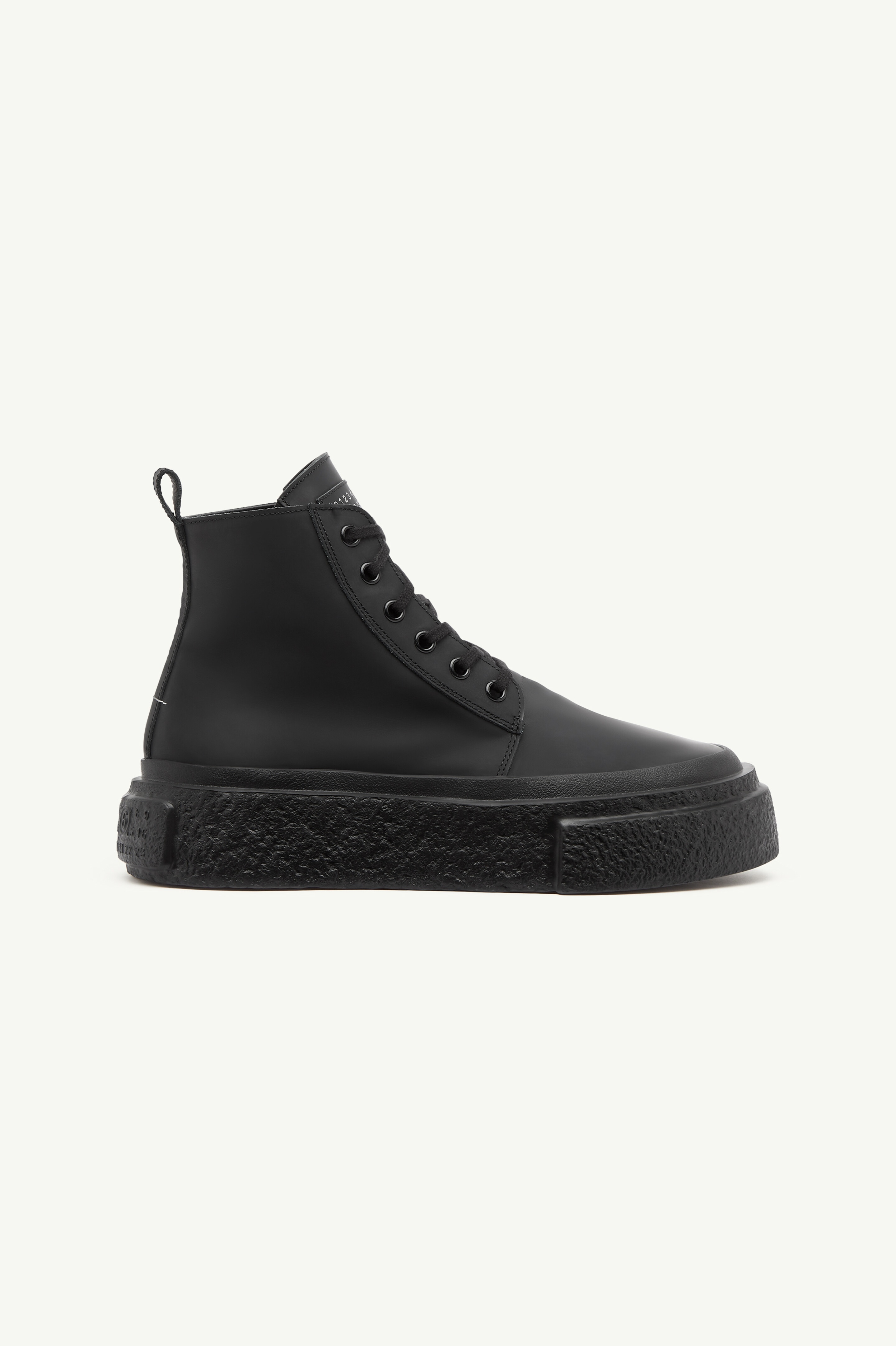Crafted in calf leather with a rubber sole, MM6’s Gambetta sneakers are inspired by the label’s clean-lined ethos and are presented in a new ankle-length height. The design is detailed by leather paneling and an MM6 signature on the tongue. MM6's discreet yet distinct signature, a horizontal white stitch line, is present on the back of the shoes. Product Details Item ID SH1WS0010P7020T8013 Upper: 100% calf leather Lining: 100% calf leather Inside: 100% calf leather Sole: 100% rubber Lace-up sneakers in calf leather Ankle height MM6 label on the tab White stitch line at the back Made in Italy