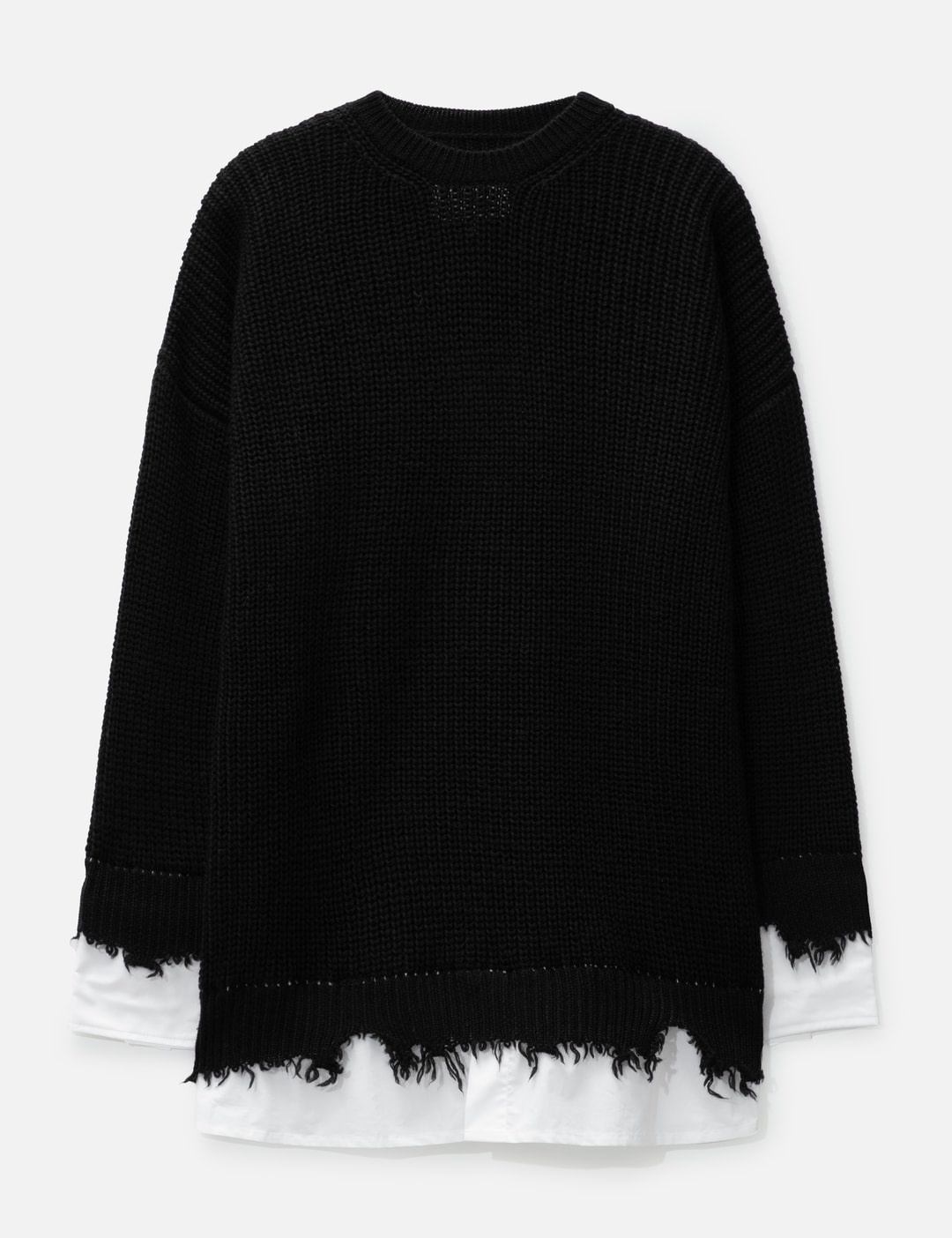 - MM6 Maison Margiela - Bi-Fabric Knit Sweater - Poly-wool blend knit sweater - Poplin cotton layer at cuffs and hem - Frayed edges - Color: Black - Material: 52% Polyester, 48% Wool - See more Knitwear and Clothing SIZING - Model wears size S - Model measures: Height 177cm, Chest 32”/81cm, Waist 23.5”/59.7cm, Hip 33’’/83.8cm