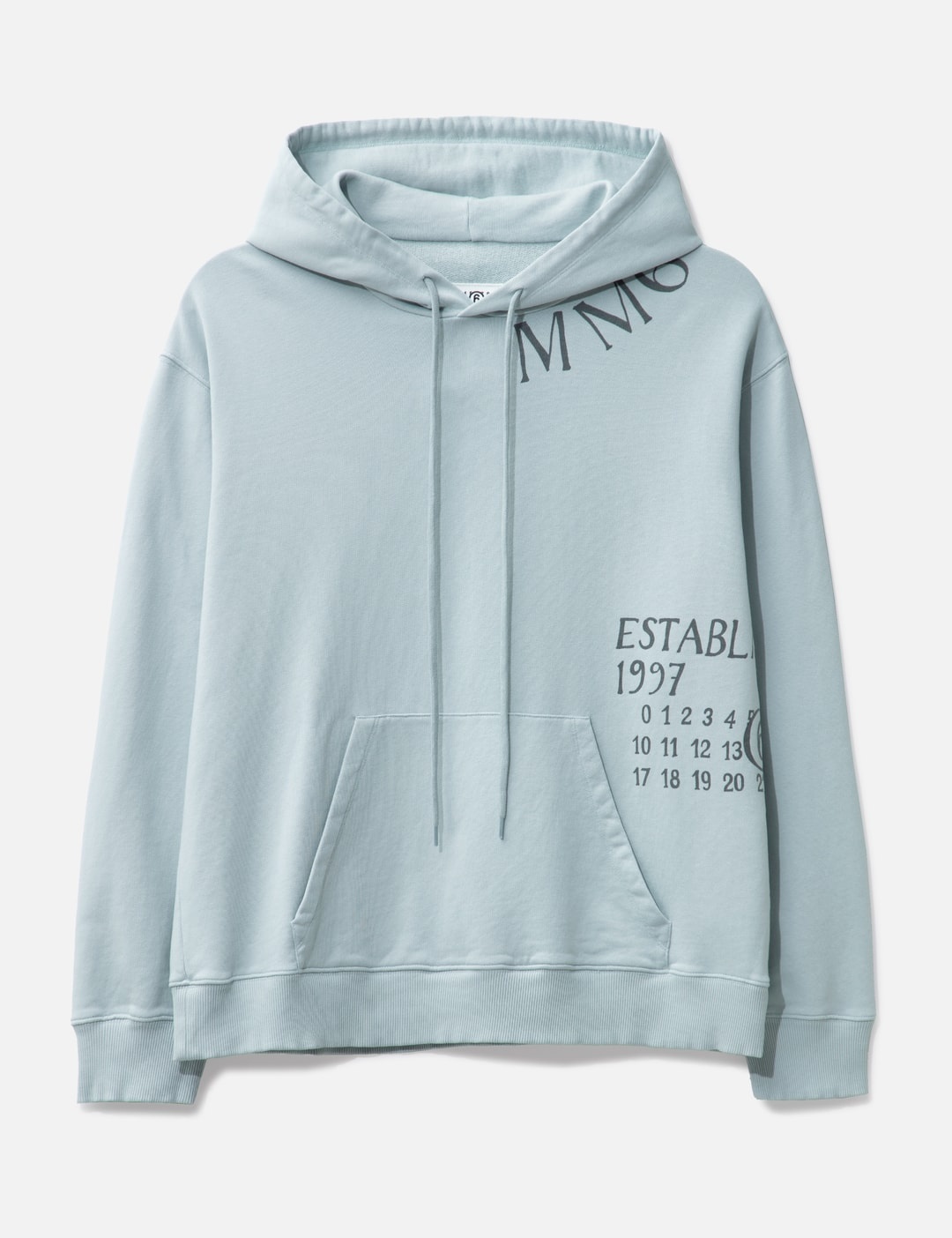 - MM6 Maison Margiela - Numeric Sweatshirt - Drawstring hood - Off-centered logo print - Kangaroo pocket - Ribbed cuffs and hem - Made in Italy - Color: Light Blue - Material: 100% Cotton - See more Hoodies and Clothing SIZING - Model wears size M - Model measures: Height 186cm, Chest 34”/86cm, Waist 28”/71cm, Hip 36”/91cm