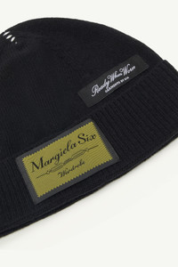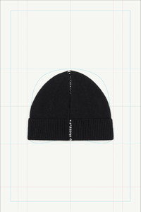 This wool blend beanie features vertical stitch detailing from crown to hem, a graphic interruption across its ribbed knit. Exposed labels, usually found inside garments, are brought outside, challenging conventions of finish and construction. Product Details Item ID S52TB0014M13218900 Primary fabric: 100% wool Gauge 7 Woven logo label on the front Ribbed turn-up brim Back stitch detailing Made in Italy